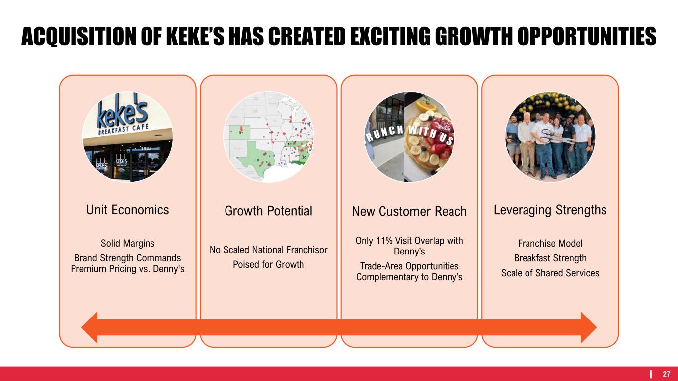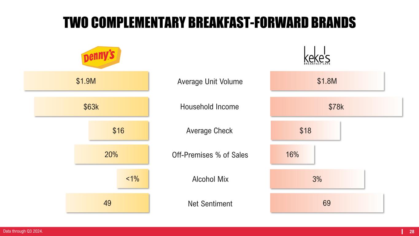 27 ACQUISITION OF KEKE’S HAS CREATED EXCITING GROWTH OPPORTUNITIES Unit Economics Solid Margins Brand Strength Commands Premium Pricing vs. Denny's Growth Potential No Scaled National Franchisor Poised for Growth New Customer Reach Only 11% Visit Overlap with Denny’s Trade-Area Opportunities Complementary to Denny’s Leveraging Strengths Franchise Model Breakfast Strength Scale of Shared Services