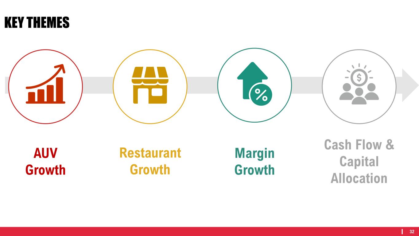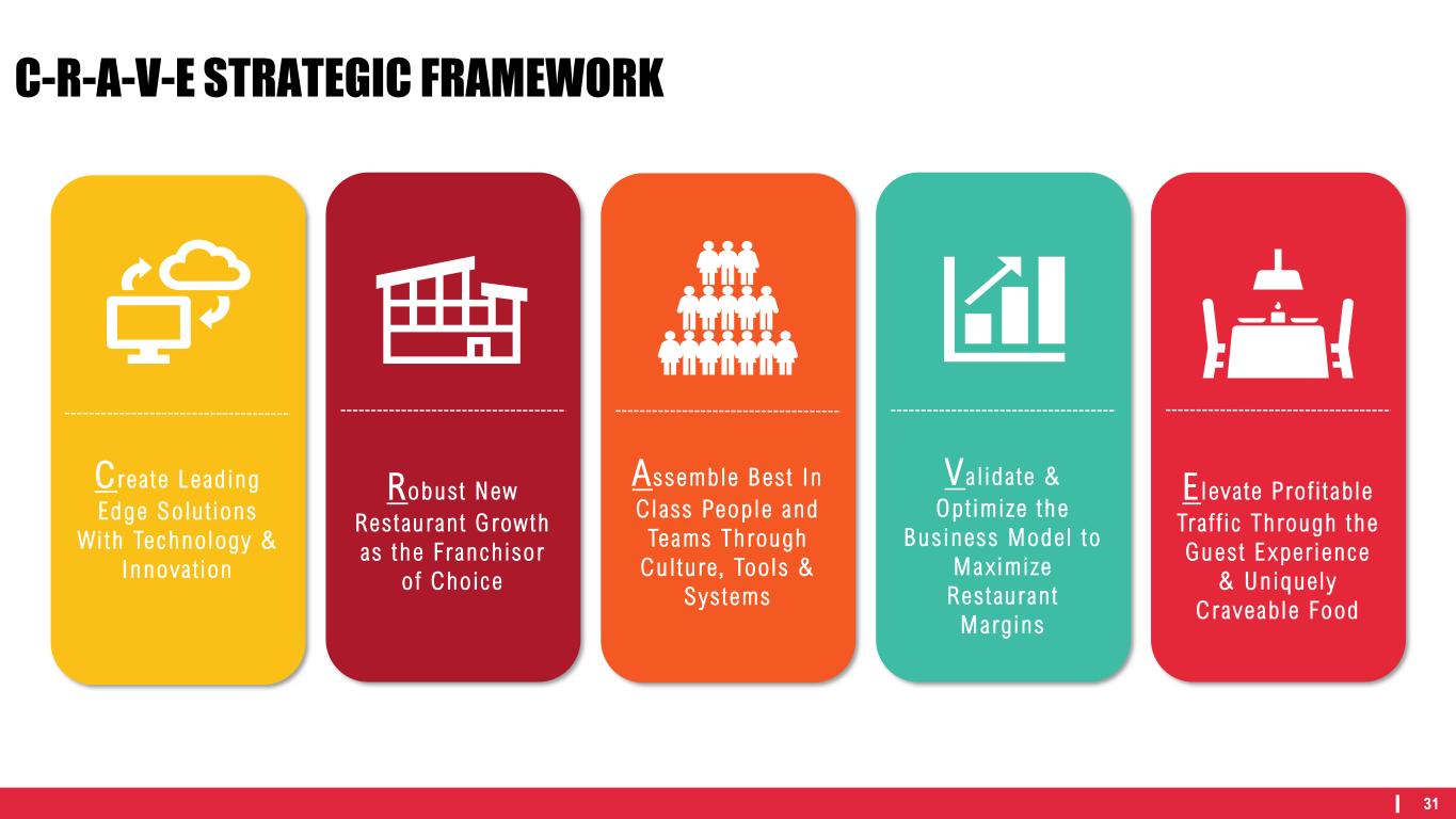 31 C-R-A-V-E STRATEGIC FRAMEWORK Va l ida te & Opt imize the Bus iness Model to Max imize Res tauran t Margins E l eva te Pro f i t ab le Tra f f ic Th rough the Gues t Exper ience & Un ique ly C raveable Food C rea te Lead ing Edge So lu t ions Wi th Technology & Innova t ion Robust New Res tauran t G row th as the Franch isor o f Cho ice Assemble Bes t I n C l ass Peop le and Teams Through Cu l tu re, Tools & Sys tems
