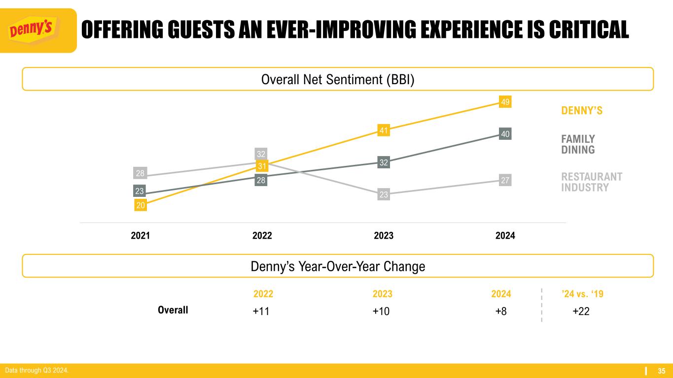 34 DENNY’S LEADERSHIP TEAM Patty Trevino SVP – Chief Brand Officer August 2024 Ethan Gallagher SVP – Finance January 2024 Chris Bode President – Denny’s Inc. September 2024 Fasika Melaku SVP – Human Resources & Chief Learning Officer September 2015 ~
