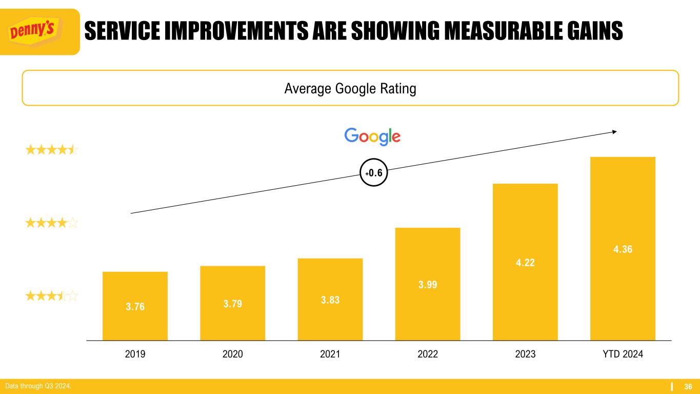 35 OFFERING GUESTS AN EVER-IMPROVING EXPERIENCE IS CRITICAL DENNY’S FAMILY DINING RESTAURANT INDUSTRY Overall Net Sentiment (BBI) Denny’s Year-Over-Year Change +11 +10 +8 +22Overall ’24 vs. ‘192022 2023 2024 20 31 41 49 23 28 32 40 28 32 23 27 2021 2022 2023 2024 Data through Q3 2024.