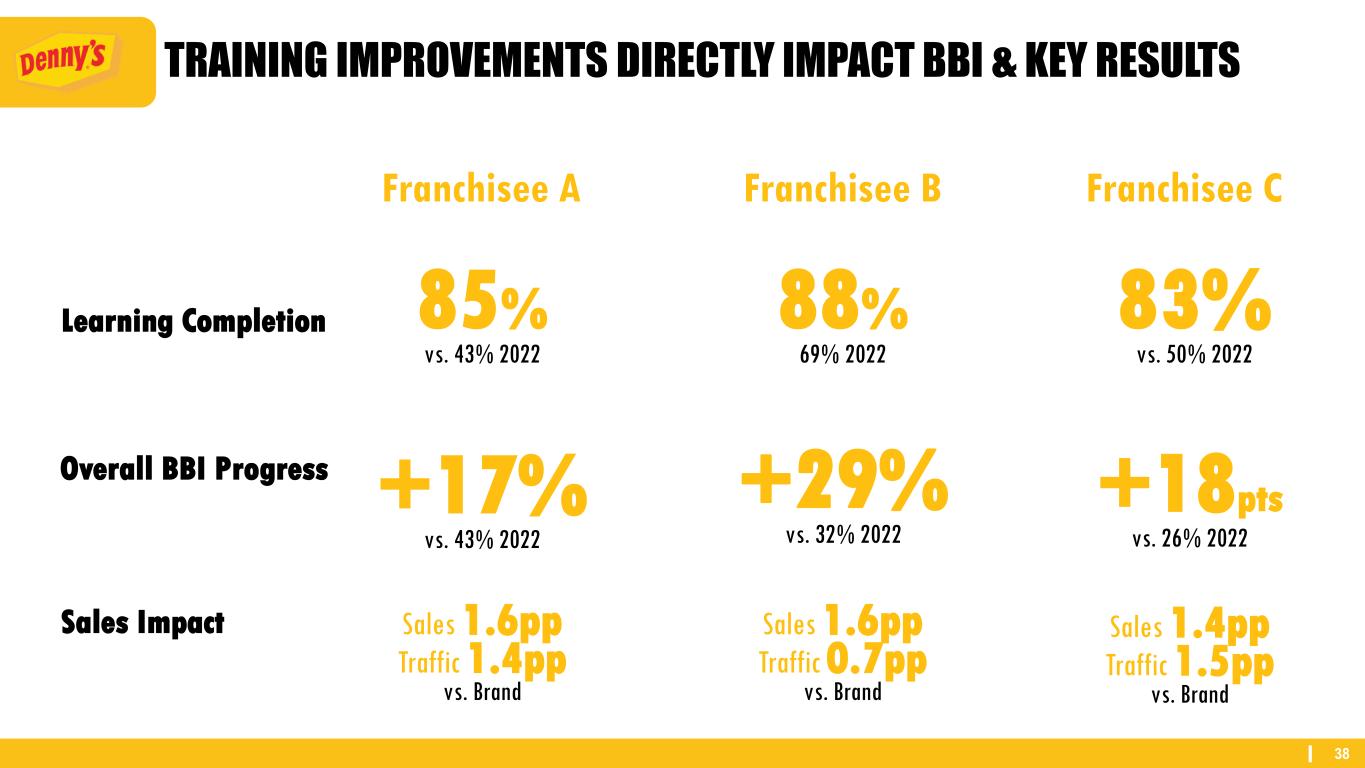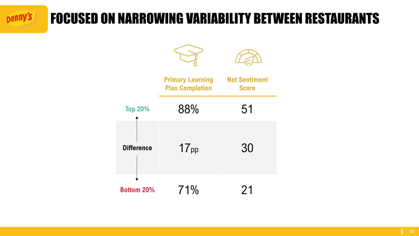 37 FOCUSED ON NARROWING VARIABILITY BETWEEN RESTAURANTS Primary Learning Plan Completion Net Sentiment Score Top 20% 88% 51 Difference 17pp 30 Bottom 20% 71% 21