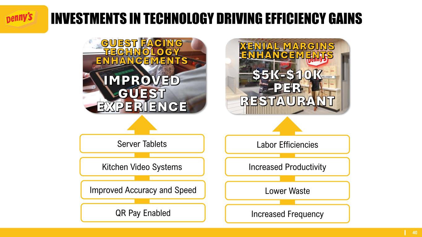 40 INVESTMENTS IN TECHNOLOGY DRIVING EFFICIENCY GAINS Server Tablets Kitchen Video Systems Improved Accuracy and Speed QR Pay Enabled GUEST FACING TECHNOLOGY ENHANCEMENTS IMPROVED GUEST EXPERIENCE XENIAL MARGINS ENHANCEMENTS $5K-$10K PER RESTAURANT Labor Efficiencies Increased Productivity Lower Waste Increased Frequency