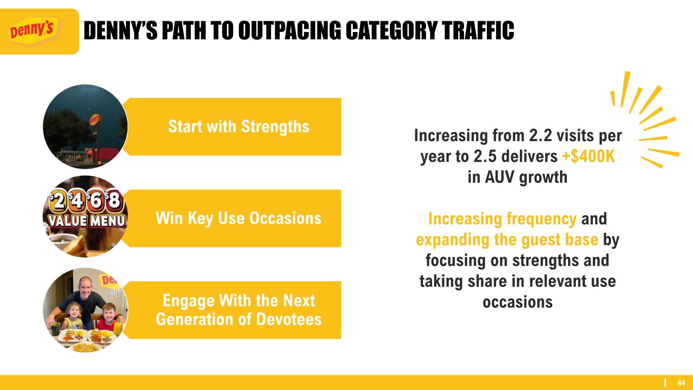 44 DENNY’S PATH TO OUTPACING CATEGORY TRAFFIC Start with Strengths Win Key Use Occasions Engage With the Next Generation of Devotees Increasing from 2.2 visits per year to 2.5 delivers +$400K in AUV growth Increasing frequency and expanding the guest base by focusing on strengths and taking share in relevant use occasions