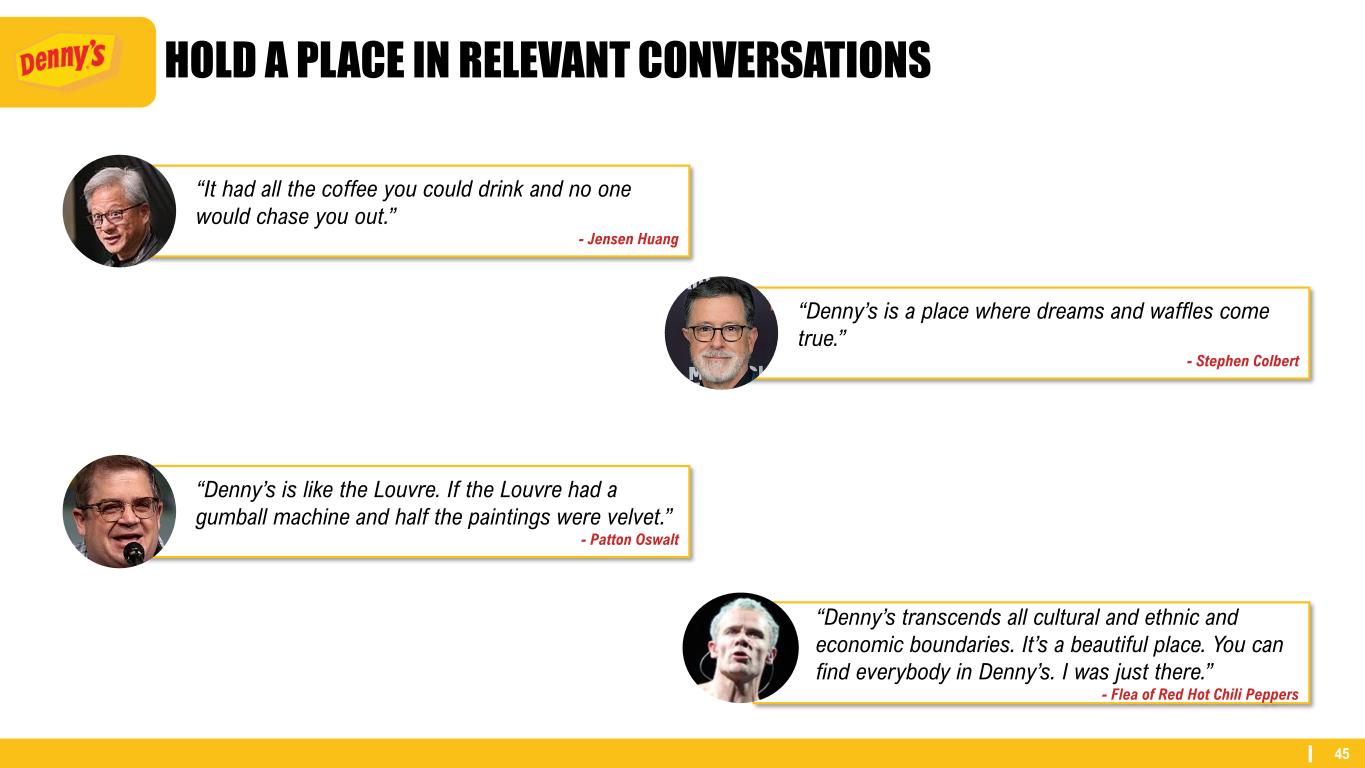 45 “Denny’s is a place where dreams and waffles come true.” - Stephen Colbert “Denny’s is like the Louvre. If the Louvre had a gumball machine and half the paintings were velvet.” - Patton Oswalt “Denny’s transcends all cultural and ethnic and economic boundaries. It’s a beautiful place. You can find everybody in Denny’s. I was just there.” - Flea of Red Hot Chili Peppers “It had all the coffee you could drink and no one would chase you out.” - Jensen Huang HOLD A PLACE IN RELEVANT CONVERSATIONS