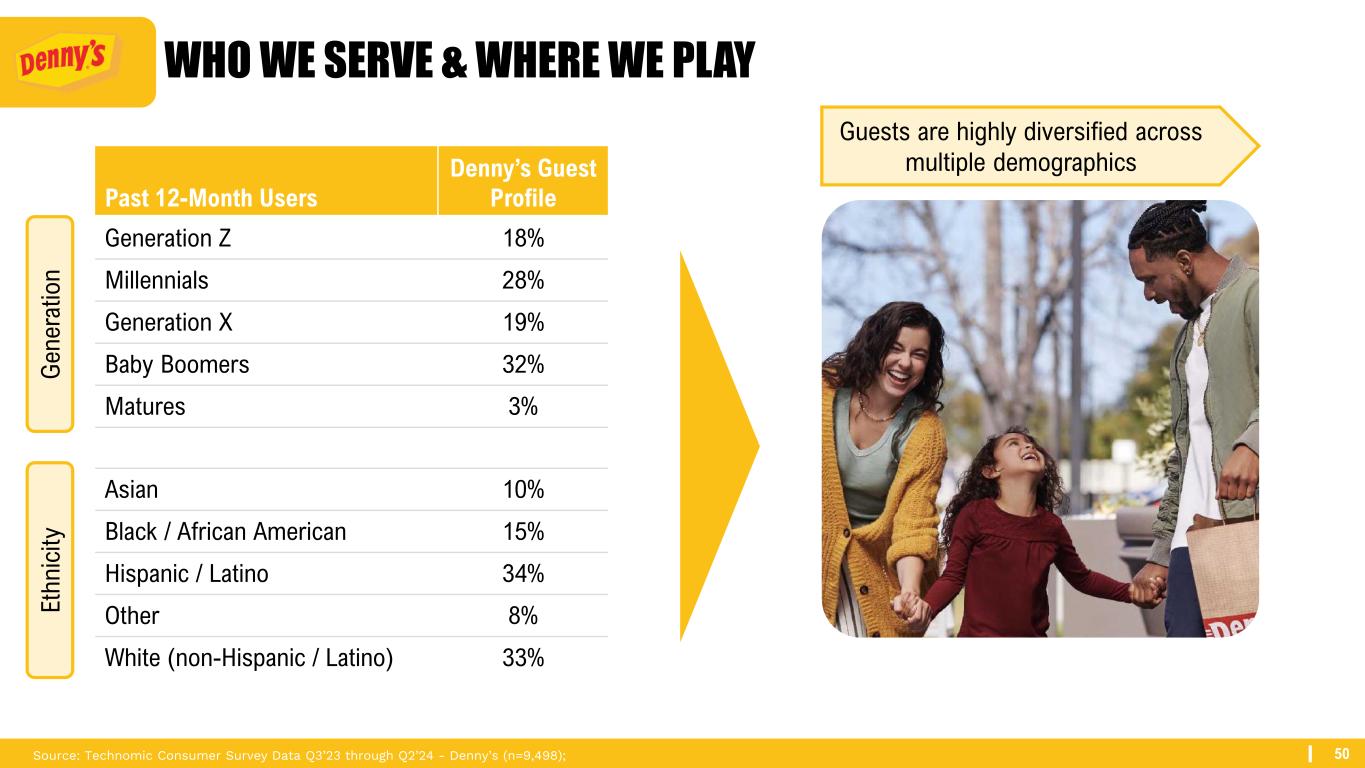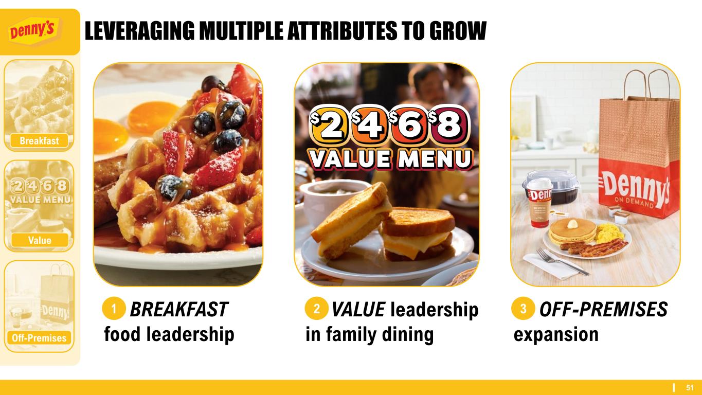50 WHO WE SERVE & WHERE WE PLAY Guests are highly diversified across multiple demographics Past 12-Month Users Denny’s Guest Profile Generation Z 18% Millennials 28% Generation X 19% Baby Boomers 32% Matures 3% Asian 10% Black / African American 15% Hispanic / Latino 34% Other 8% White (non-Hispanic / Latino) 33% Source: Technomic Consumer Survey Data Q3’23 through Q2’24 - Denny’s (n=9,498); G e n e ra ti o n E th n ic it y