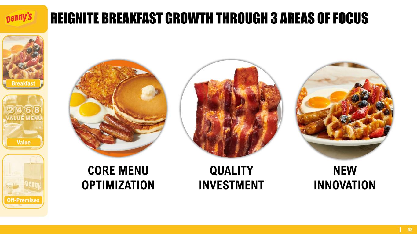 51 LEVERAGING MULTIPLE ATTRIBUTES TO GROW 1. BREAKFAST food leadership OFF-PREMISES expansion VALUE leadership in family diningOff-Premises 1 2 3 Breakfast Value
