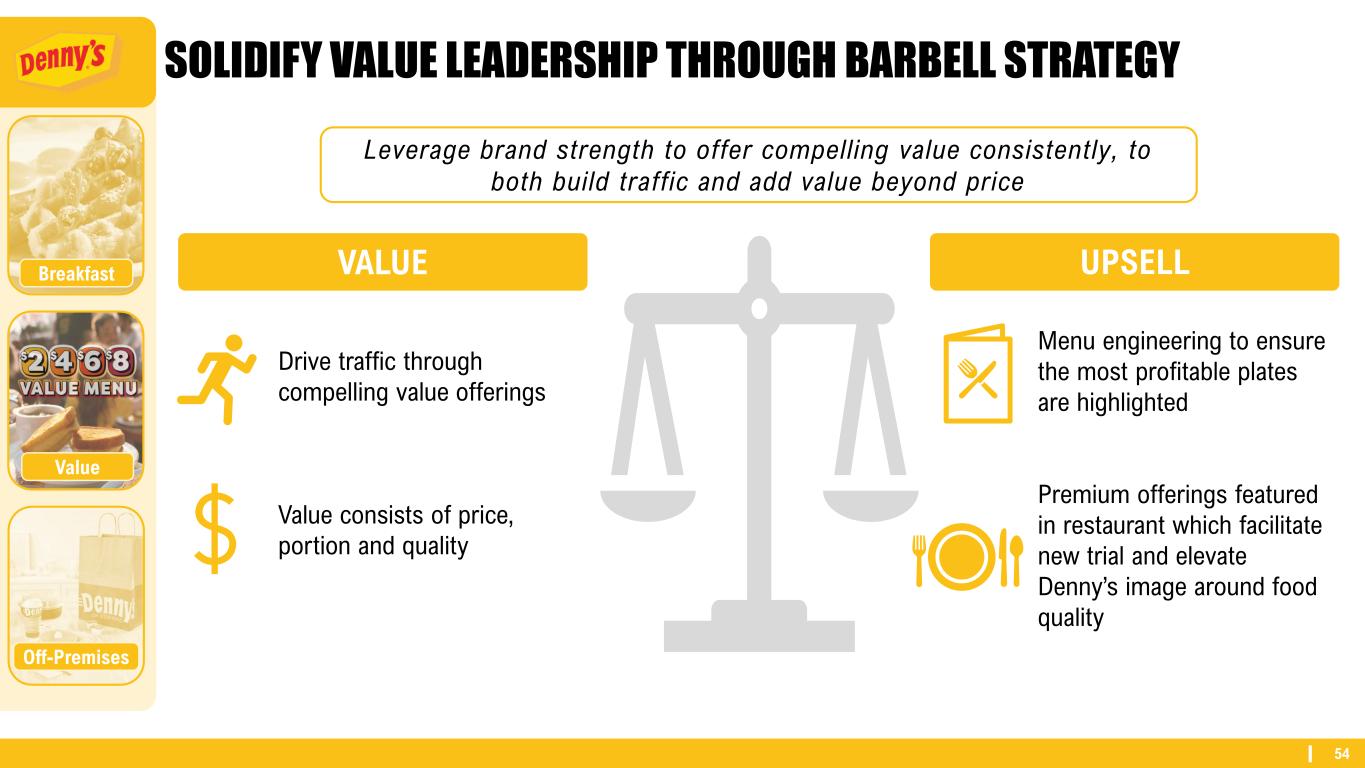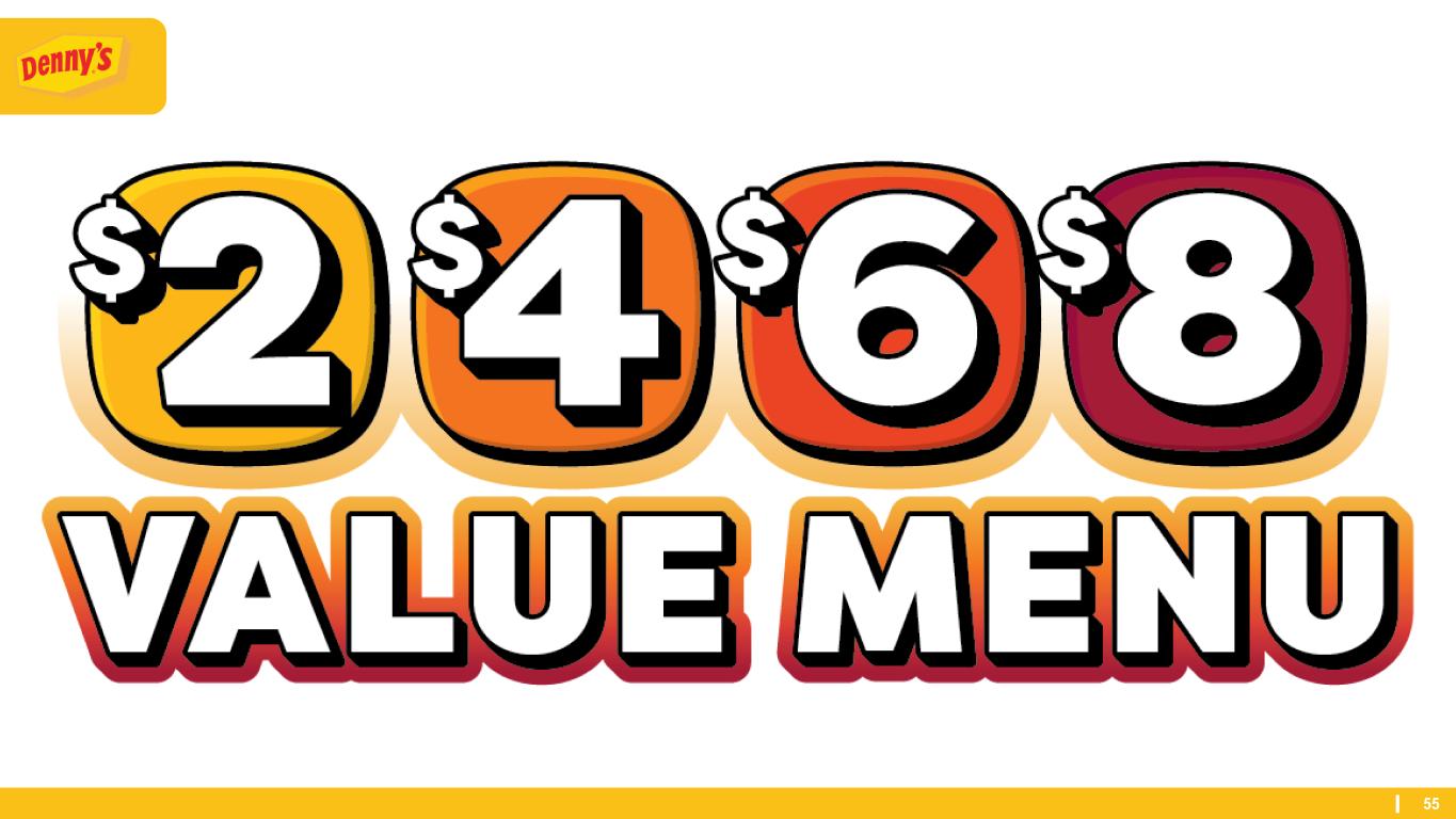 54 SOLIDIFY VALUE LEADERSHIP THROUGH BARBELL STRATEGY VALUE UPSELL Leverage brand strength to offer compelling value consistently, to both build traffic and add value beyond price Drive traffic through compelling value offerings Value consists of price, portion and quality Menu engineering to ensure the most profitable plates are highlighted Premium offerings featured in restaurant which facilitate new trial and elevate Denny’s image around food quality Off-Premises Breakfast Value