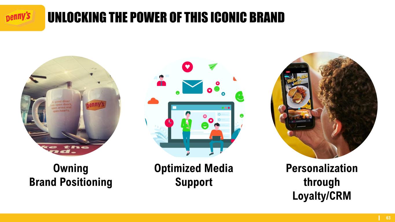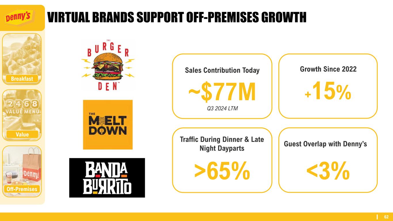 62 VIRTUAL BRANDS SUPPORT OFF-PREMISES GROWTH ~$77M +15% >65% <3% Traffic During Dinner & Late Night Dayparts Growth Since 2022 Guest Overlap with Denny’s Sales Contribution Today Off-Premises Breakfast Value Q3 2024 LTM
