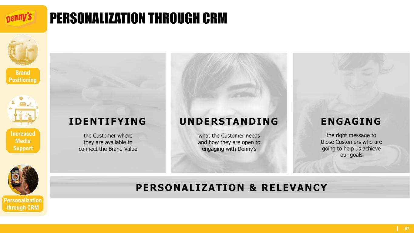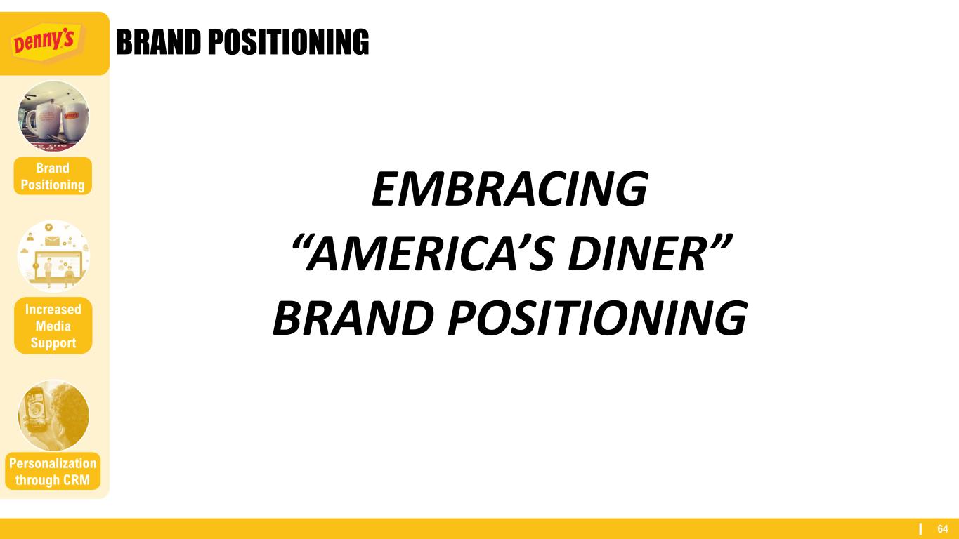 64 BRAND POSITIONING Personalization through CRM Brand Positioning Increased Media Support EMBRACING “AMERICA’S DINER” BRAND POSITIONING