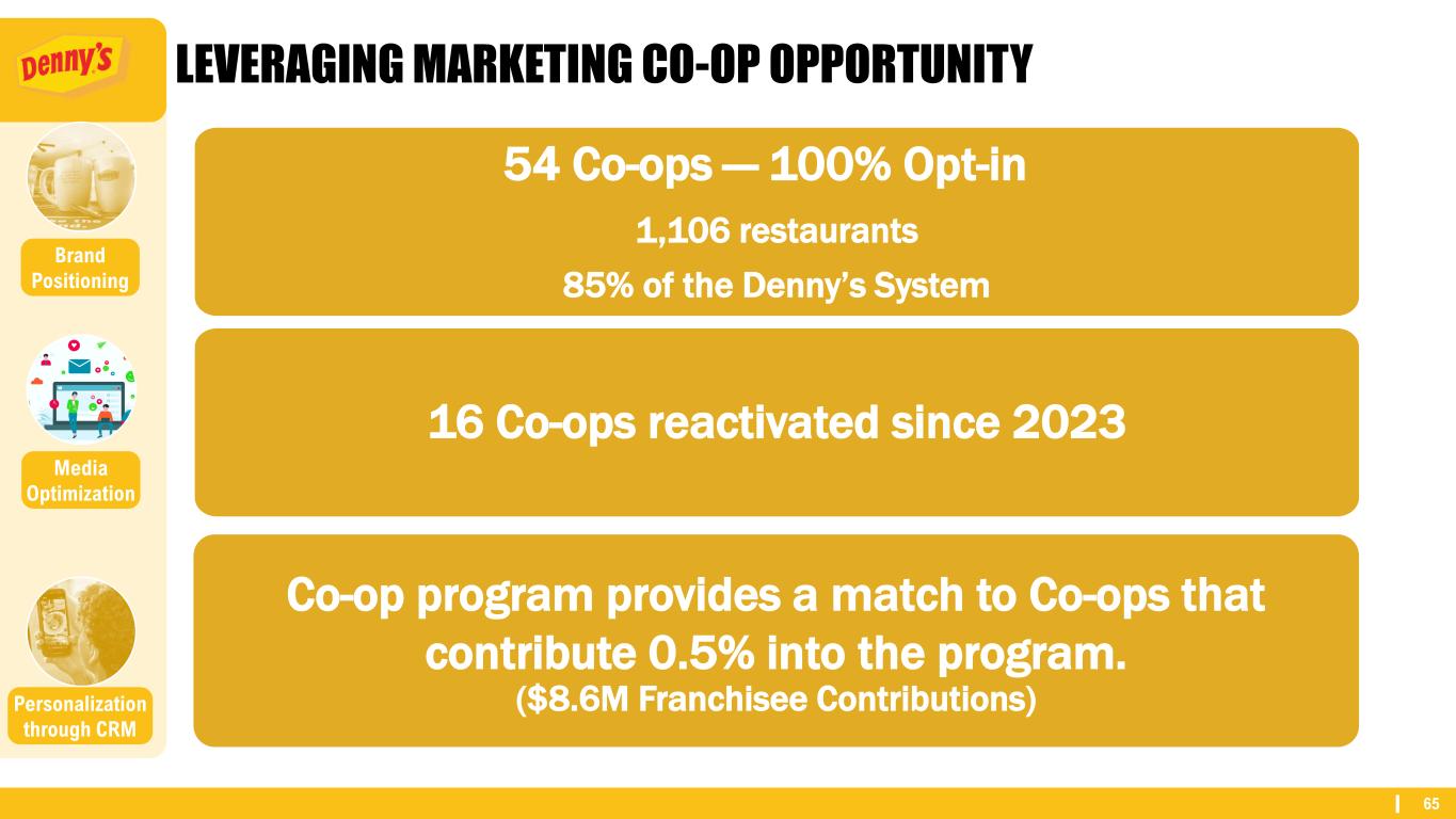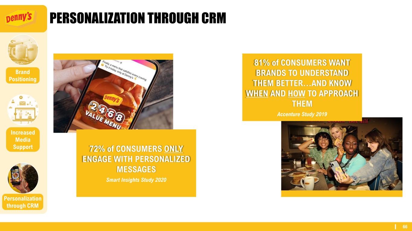 65 LEVERAGING MARKETING CO-OP OPPORTUNITY Personalization through CRM Brand Positioning Media Optimization 54 Co-ops — 100% Opt-in 1,106 restaurants 85% of the Denny’s System Co-op program provides a match to Co-ops that contribute 0.5% into the program. ($8.6M Franchisee Contributions) 16 Co-ops reactivated since 2023