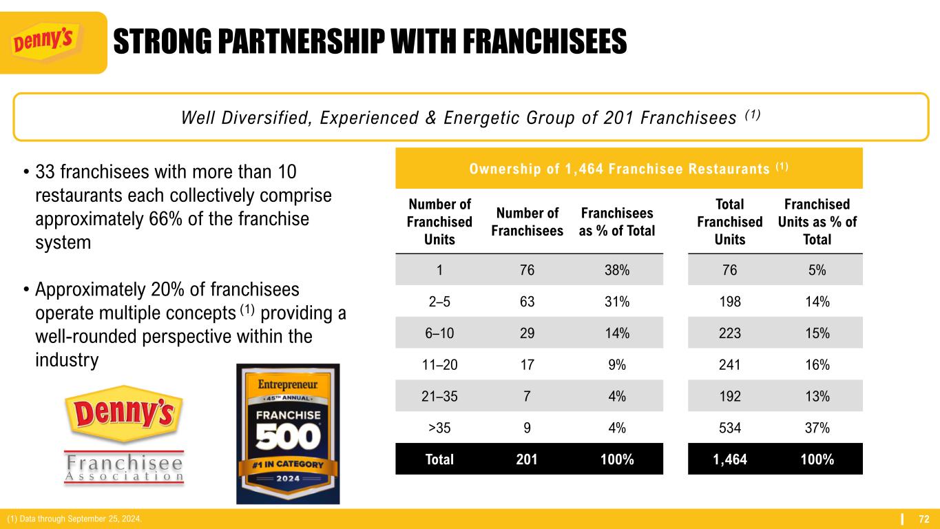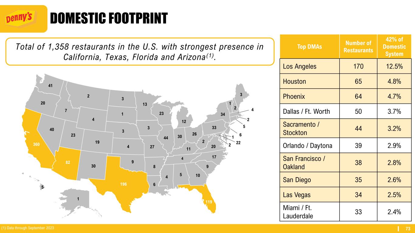 72 STRONG PARTNERSHIP WITH FRANCHISEES Well Diversified, Experienced & Energetic Group of 201 Franchisees (1) • 33 franchisees with more than 10 restaurants each collectively comprise approximately 66% of the franchise system • Approximately 20% of franchisees operate multiple concepts (1) providing a well-rounded perspective within the industry Ownership of 1,464 Franchisee Restaurants (1) Number of Franchised Units Number of Franchisees Franchisees as % of Total Total Franchised Units Franchised Units as % of Total 1 76 38% 76 5% 2–5 63 31% 198 14% 6–10 29 14% 223 15% 11–20 17 9% 241 16% 21–35 7 4% 192 13% >35 9 4% 534 37% Total 201 100% 1,464 100% (1) Data through September 25, 2024.