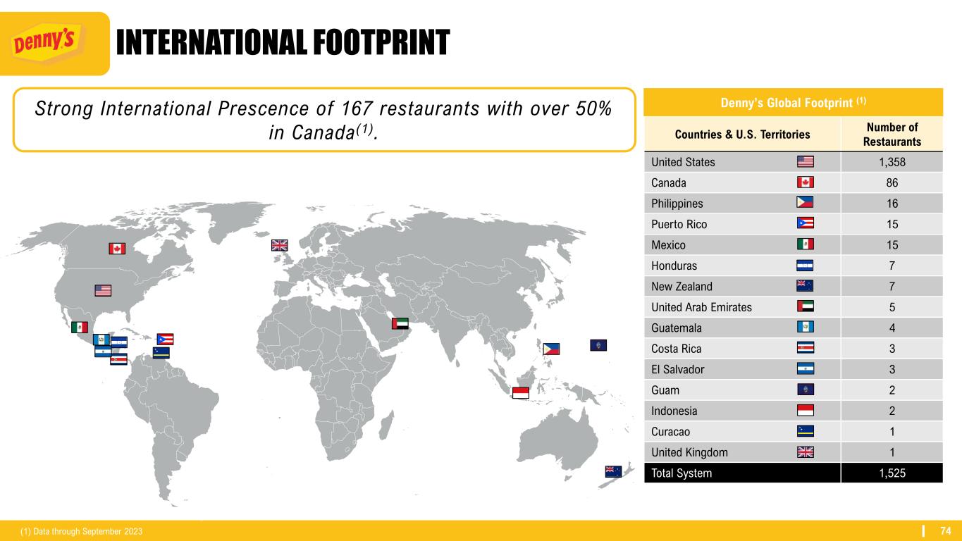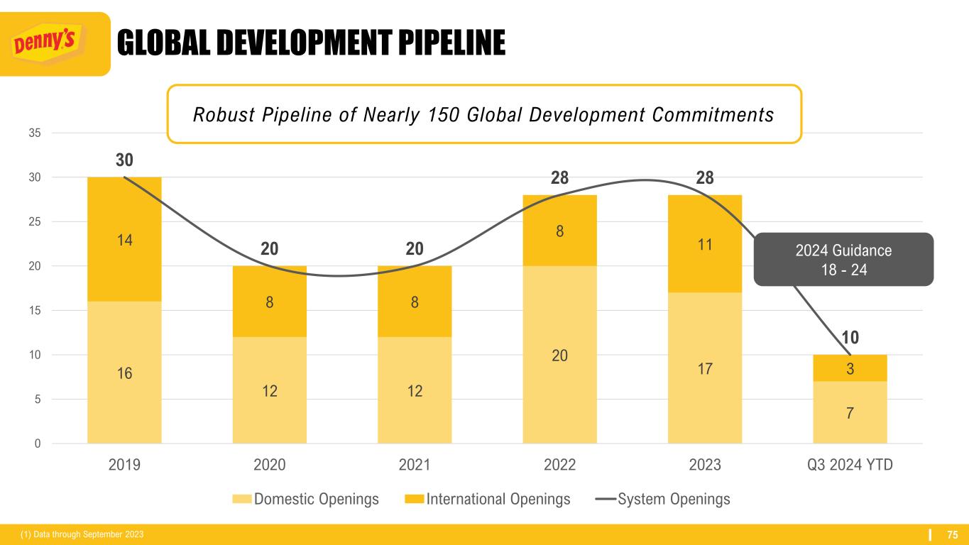 74 INTERNATIONAL FOOTPRINT Countries & U.S. Territories Number of Restaurants United States 1,358 Canada 86 Philippines 16 Puerto Rico 15 Mexico 15 Honduras 7 New Zealand 7 United Arab Emirates 5 Guatemala 4 Costa Rica 3 El Salvador 3 Guam 2 Indonesia 2 Curacao 1 United Kingdom 1 Total System 1,525 Denny’s Global Footprint (1) Strong International Prescence of 167 restaurants with over 50% in Canada(1). (1) Data through September 2023