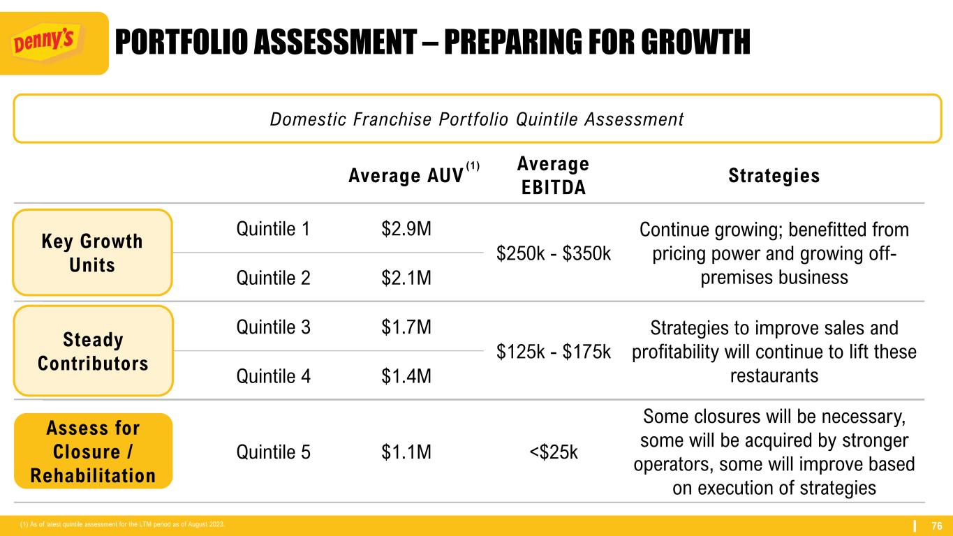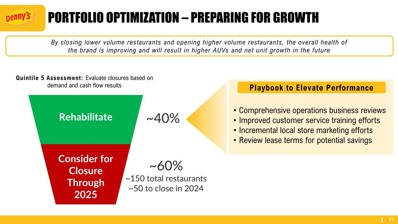76 PORTFOLIO ASSESSMENT – PREPARING FOR GROWTH Domestic Franchise Portfolio Quintile Assessment Average AUV Average EBITDA Strategies Quintile 1 $2.9M $250k - $350k Continue growing; benefitted from pricing power and growing off- premises businessQuintile 2 $2.1M Quintile 3 $1.7M $125k - $175k Strategies to improve sales and profitability will continue to lift these restaurantsQuintile 4 $1.4M Quintile 5 $1.1M <$25k Some closures will be necessary, some will be acquired by stronger operators, some will improve based on execution of strategies Key Growth Units Assess for Closure / Rehabilitation (1) As of latest quintile assessment for the LTM period as of August 2023. Steady Contributors (1)