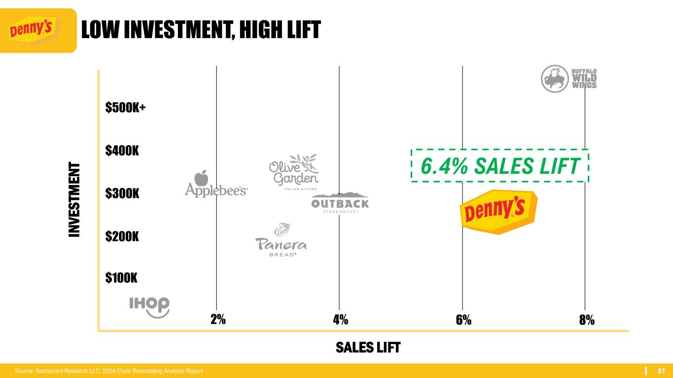81 LOW INVESTMENT, HIGH LIFT IN V E S TM E N T SALES LIFT Source: Restaurant Research LLC: 2024 Chain Remodeling Analysis Report $300K $200K $100K $500K+ $400K 2% 6%4% 8% 6.4% SALES LIFT