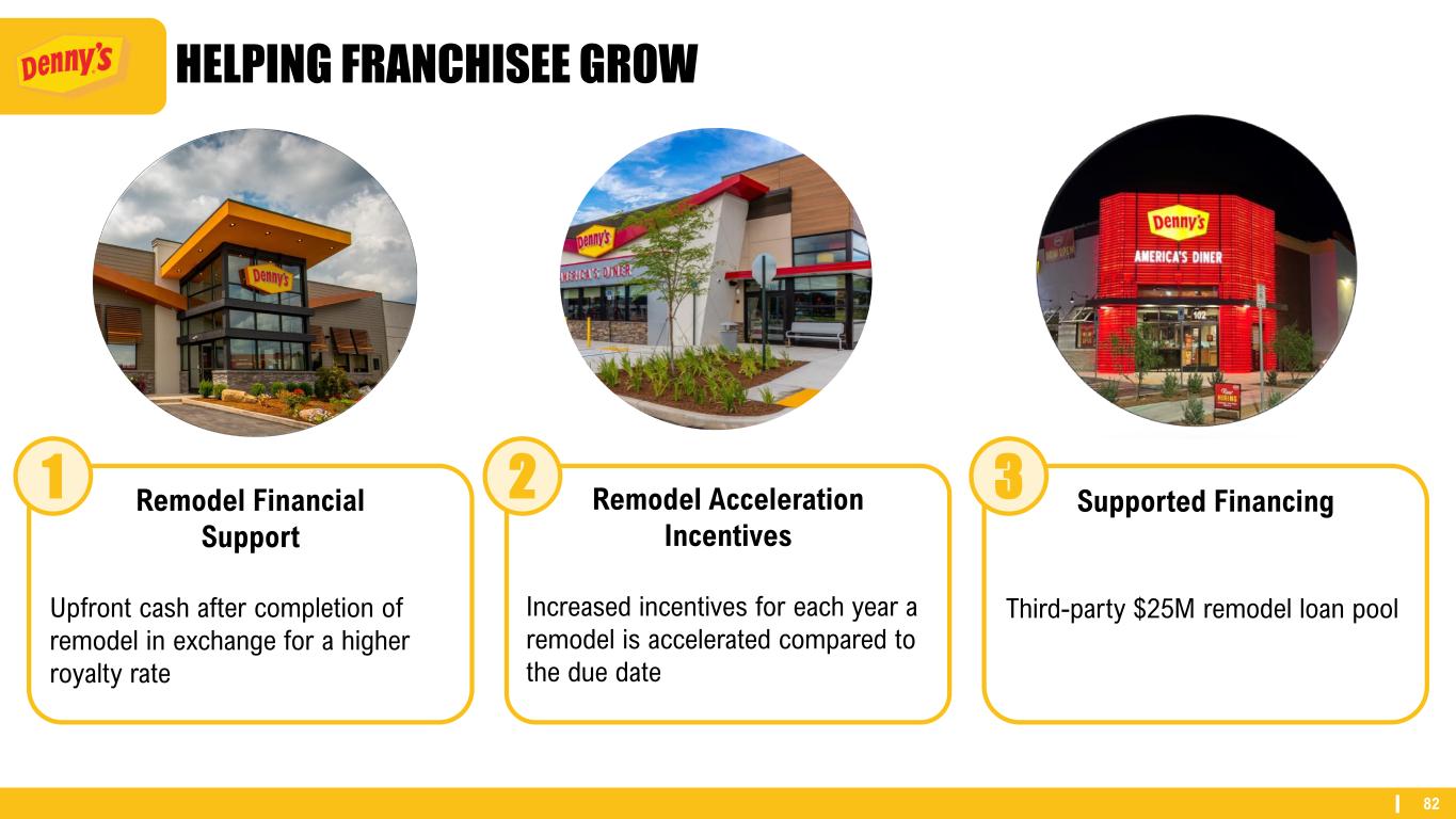 82 HELPING FRANCHISEE GROW Remodel Financial Support Upfront cash after completion of remodel in exchange for a higher royalty rate Remodel Acceleration Incentives Increased incentives for each year a remodel is accelerated compared to the due date Supported Financing Third-party $25M remodel loan pool 1 2 3