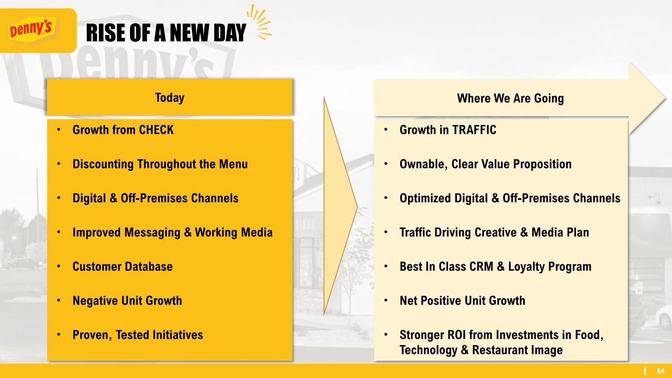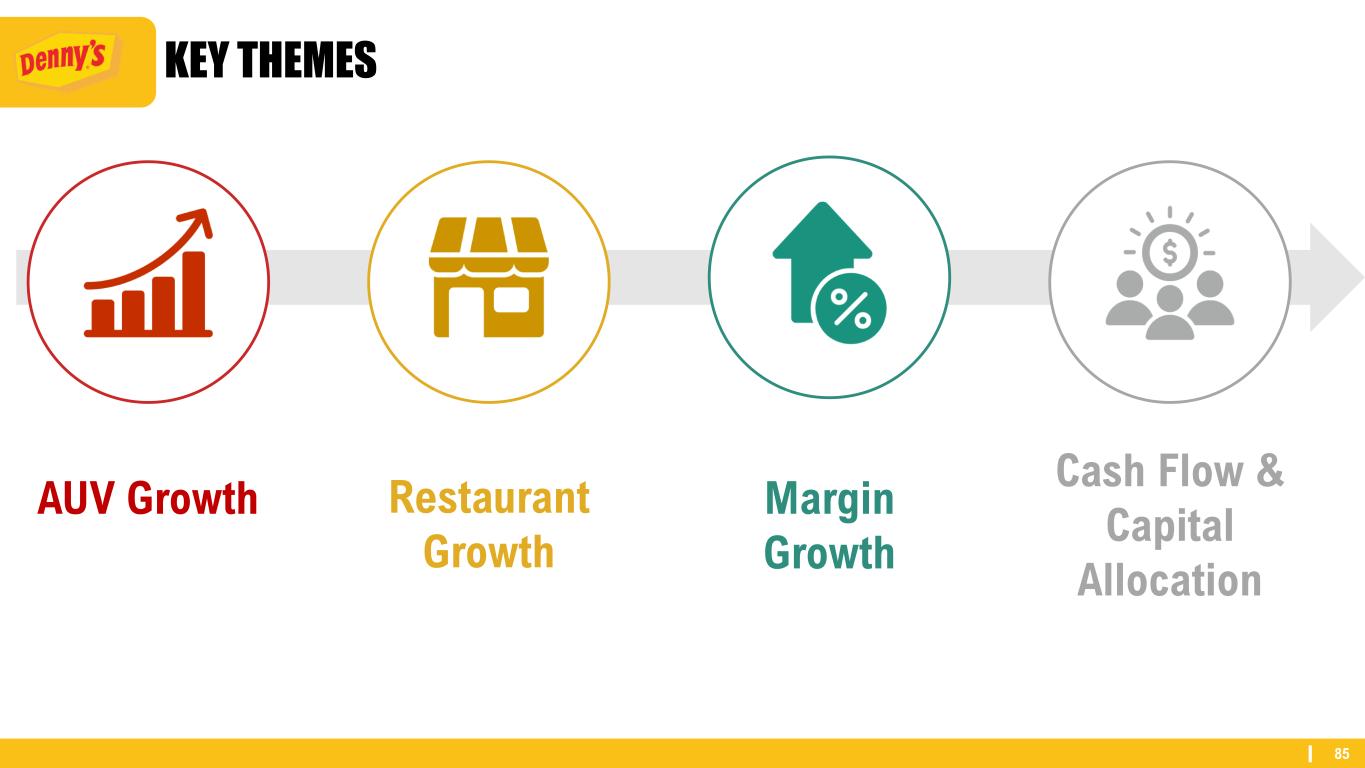 84 • Growth in TRAFFIC • Ownable, Clear Value Proposition • Optimized Digital & Off-Premises Channels • Traffic Driving Creative & Media Plan • Best In Class CRM & Loyalty Program • Net Positive Unit Growth • Stronger ROI from Investments in Food, Technology & Restaurant Image • Growth from CHECK • Discounting Throughout the Menu • Digital & Off-Premises Channels • Improved Messaging & Working Media • Customer Database • Negative Unit Growth • Proven, Tested Initiatives RISE OF A NEW DAY Where We Are GoingToday