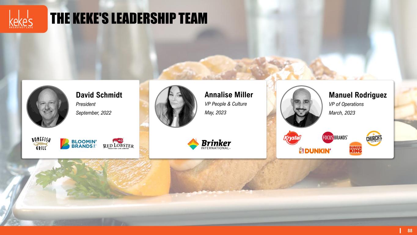 88 THE KEKE'S LEADERSHIP TEAM David Schmidt President September, 2022 Manuel Rodriguez VP of Operations March, 2023 Annalise Miller VP People & Culture May, 2023