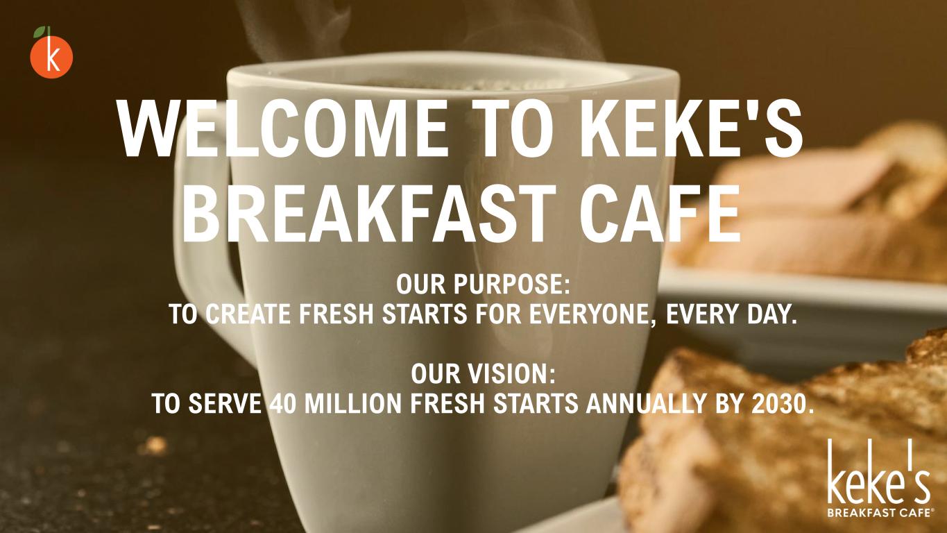 OUR PURPOSE: TO CREATE FRESH STARTS FOR EVERYONE, EVERY DAY. OUR VISION: TO SERVE 40 MILLION FRESH STARTS ANNUALLY BY 2030. WELCOME TO KEKE'S BREAKFAST CAFE