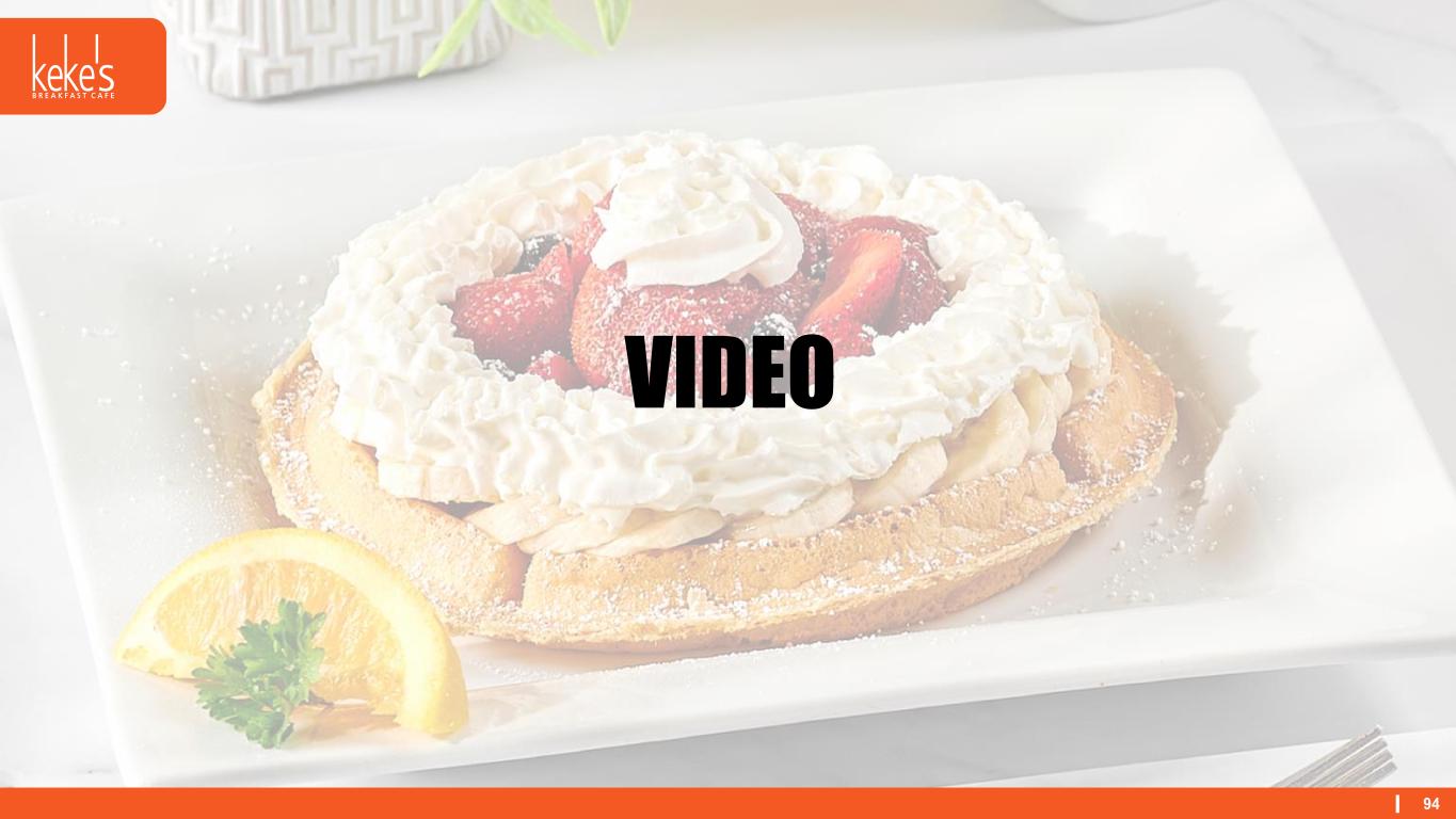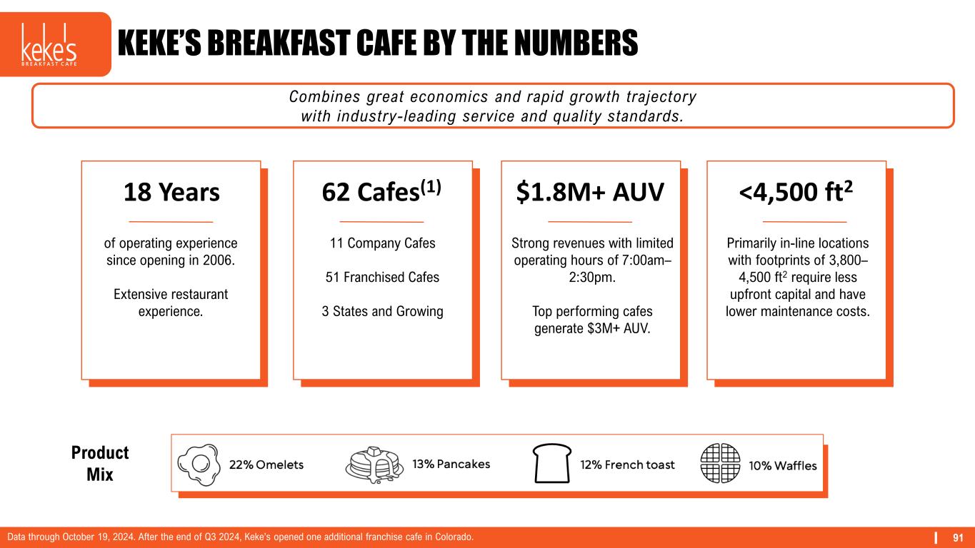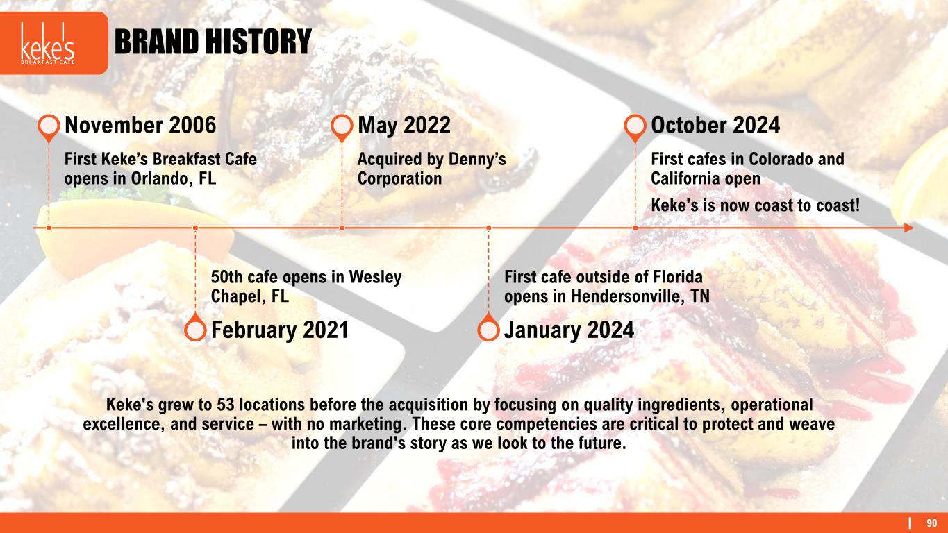 90 BRAND HISTORY Keke's grew to 53 locations before the acquisition by focusing on quality ingredients, operational excellence, and service – with no marketing. These core competencies are critical to protect and weave into the brand's story as we look to the future. First Keke’s Breakfast Cafe opens in Orlando, FL November 2006 50th cafe opens in Wesley Chapel, FL February 2021 Acquired by Denny’s Corporation May 2022 First cafe outside of Florida opens in Hendersonville, TN January 2024 First cafes in Colorado and California open Keke's is now coast to coast! October 2024