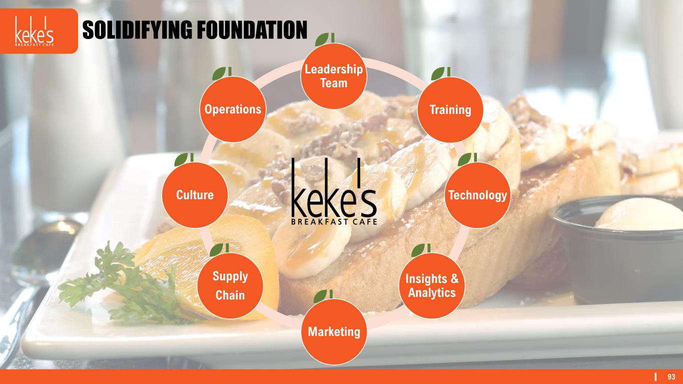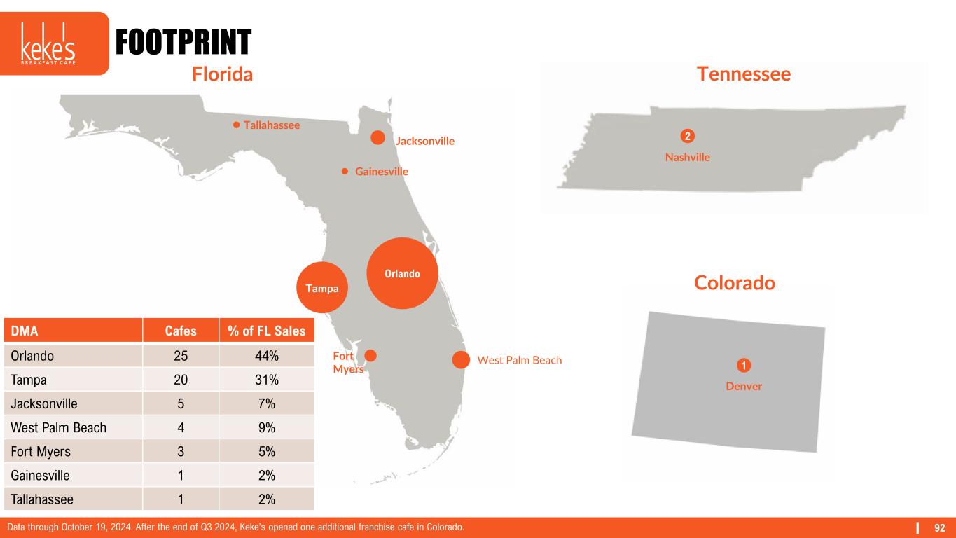 92 FOOTPRINT Orlando Tampa Gainesville Jacksonville Tallahassee West Palm BeachFort Myers DMA Cafes % of FL Sales Orlando 25 44% Tampa 20 31% Jacksonville 5 7% West Palm Beach 4 9% Fort Myers 3 5% Gainesville 1 2% Tallahassee 1 2% Florida Tennessee 2 Nashville Colorado 1 Denver Data through October 19, 2024. After the end of Q3 2024, Keke’s opened one additional franchise cafe in Colorado.