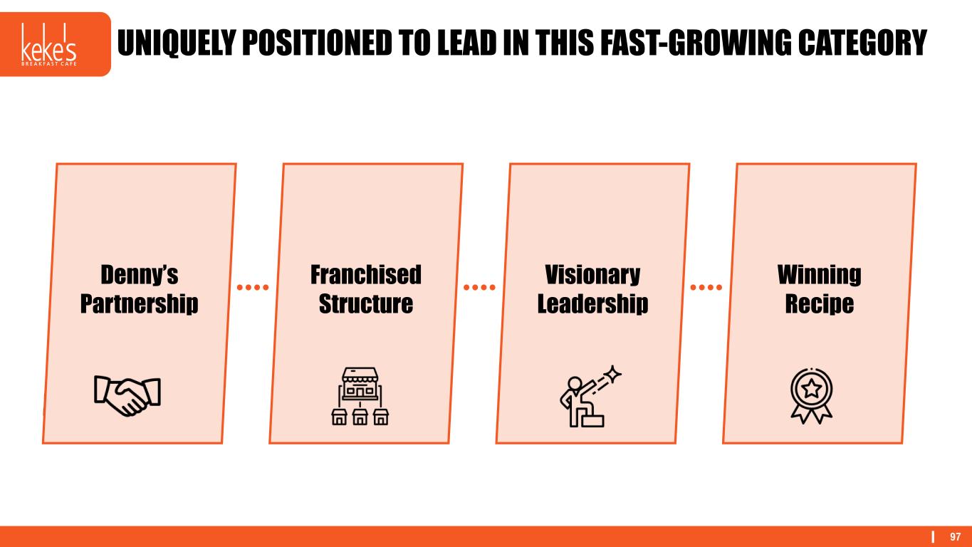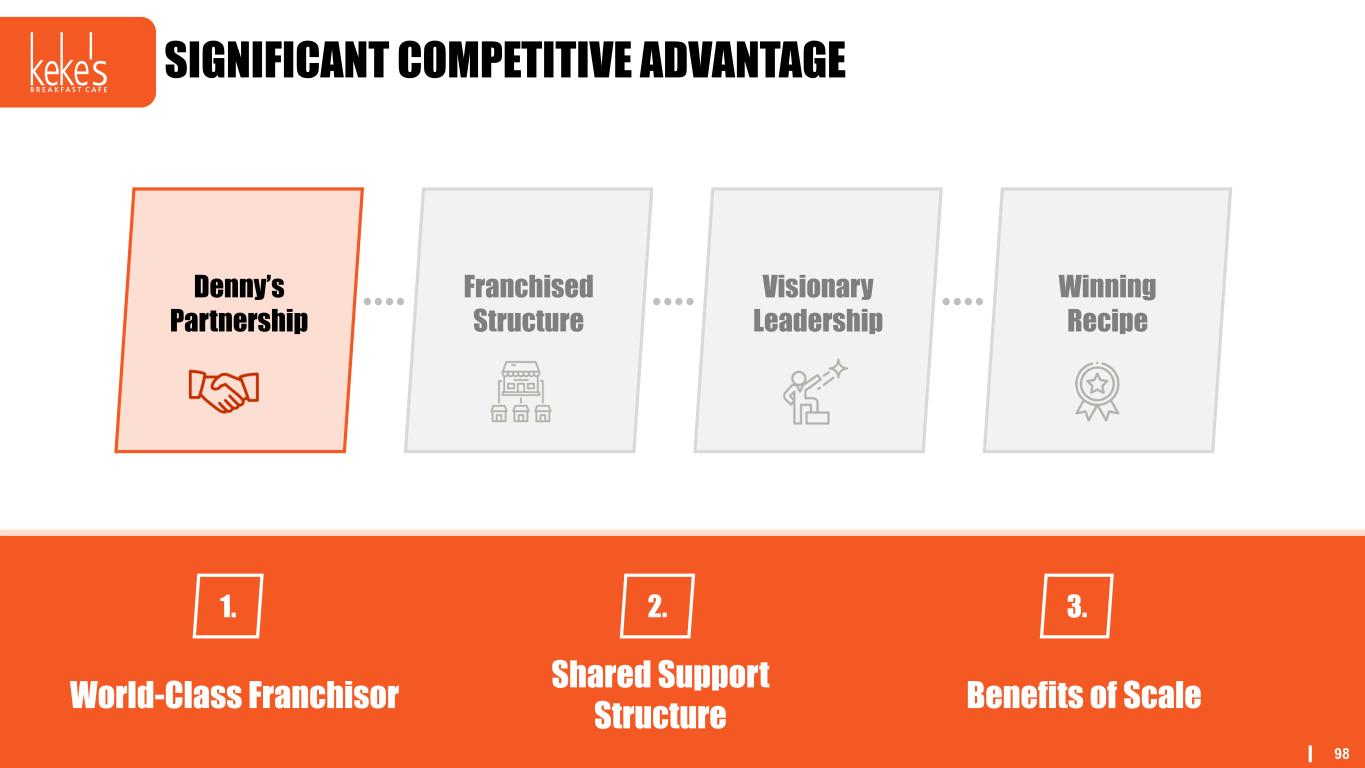 97 UNIQUELY POSITIONED TO LEAD IN THIS FAST-GROWING CATEGORY Franchised Structure Visionary Leadership Winning Recipe Denny’s Partnership