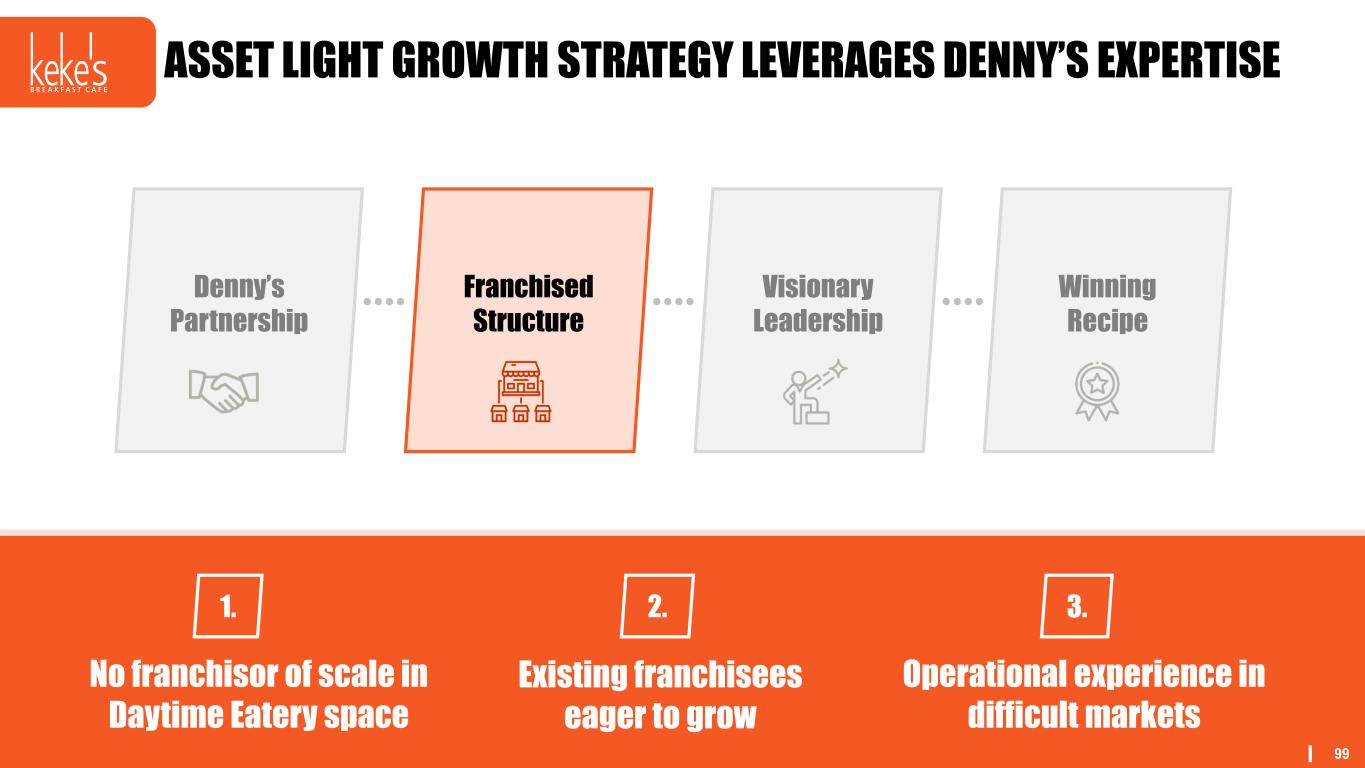 98 SIGNIFICANT COMPETITIVE ADVANTAGE Franchised Structure Visionary Leadership Winning Recipe Denny’s Partnership 1. World-Class Franchisor 2. Shared Support Structure 3. Benefits of Scale