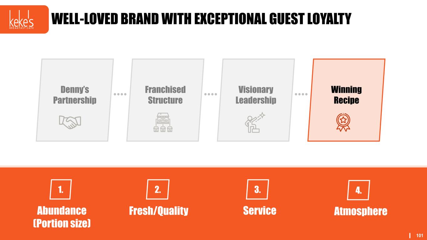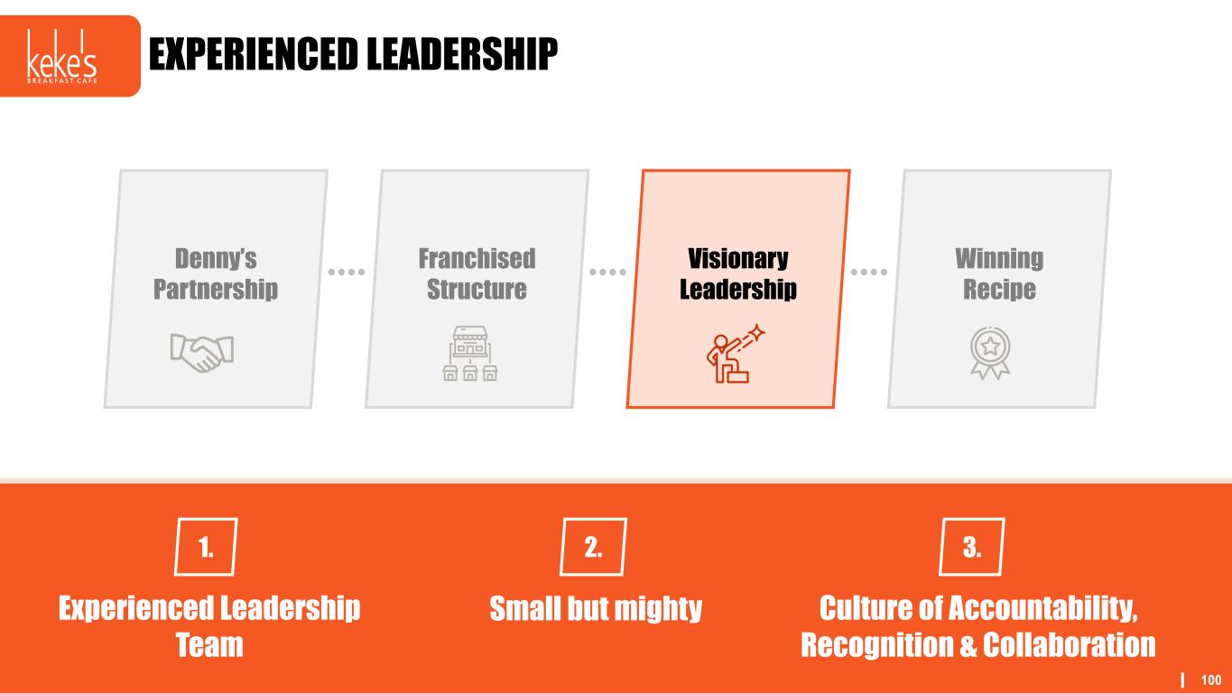 100 EXPERIENCED LEADERSHIP Franchised Structure Visionary Leadership Winning Recipe Denny’s Partnership 1. Experienced Leadership Team 2. Small but mighty 3. Culture of Accountability, Recognition & Collaboration