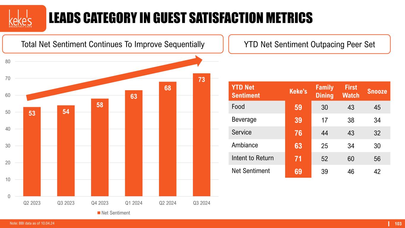 103 53 54 58 63 68 73 0 10 20 30 40 50 60 70 80 90 Q2 2023 Q3 2023 Q4 2023 Q1 2024 Q2 2024 Q3 2024 Net Sentiment LEADS CATEGORY IN GUEST SATISFACTION METRICS Note: BBI data as of 10.04.24 YTD Net Sentiment Keke’s Family Dining First Watch Snooze Food 59 30 43 45 Beverage 39 17 38 34 Service 76 44 43 32 Ambiance 63 25 34 30 Intent to Return 71 52 60 56 Net Sentiment 69 39 46 42 Total Net Sentiment Continues To Improve Sequentially YTD Net Sentiment Outpacing Peer Set