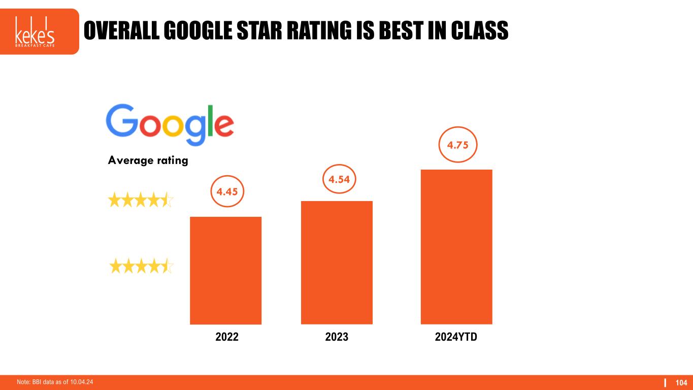 104 OVERALL GOOGLE STAR RATING IS BEST IN CLASS Note: BBI data as of 10.04.24 Average rating 4.45 4.75 4.54 2022 2023 2024YTD