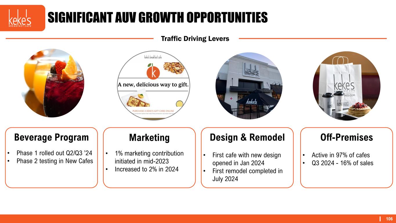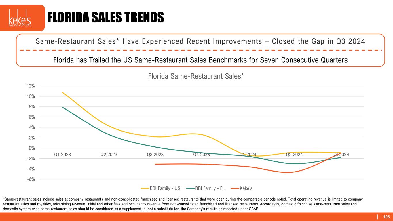 105 FLORIDA SALES TRENDS Same-Restaurant Sales* Have Experienced Recent Improvements – Closed the Gap in Q3 2024 Florida has Trailed the US Same-Restaurant Sales Benchmarks for Seven Consecutive Quarters -6% -4% -2% 0% 2% 4% 6% 8% 10% 12% Q1 2023 Q2 2023 Q3 2023 Q4 2023 Q1 2024 Q2 2024 Q3 2024 Florida Same-Restaurant Sales* BBI Family - US BBI Family - FL Keke's *Same-restaurant sales include sales at company restaurants and non-consolidated franchised and licensed restaurants that were open during the comparable periods noted. Total operating revenue is limited to company restaurant sales and royalties, advertising revenue, initial and other fees and occupancy revenue from non-consolidated franchised and licensed restaurants. Accordingly, domestic franchise same-restaurant sales and domestic system-wide same-restaurant sales should be considered as a supplement to, not a substitute for, the Company’s results as reported under GAAP.