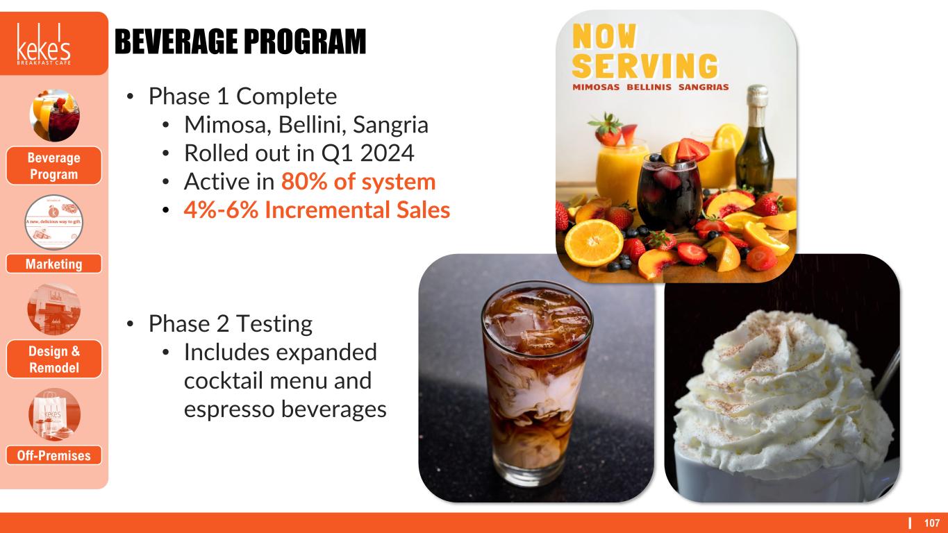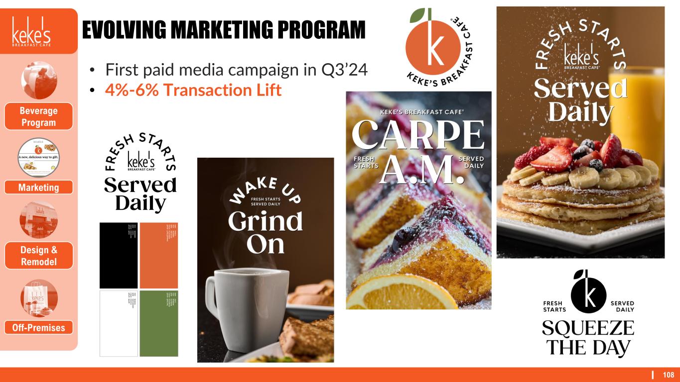 107 BEVERAGE PROGRAM Design & Remodel Off-Premises Beverage Program Marketing • Phase 1 Complete • Mimosa, Bellini, Sangria • Rolled out in Q1 2024 • Active in 80% of system • 4%-6% Incremental Sales • Phase 2 Testing • Includes expanded cocktail menu and espresso beverages