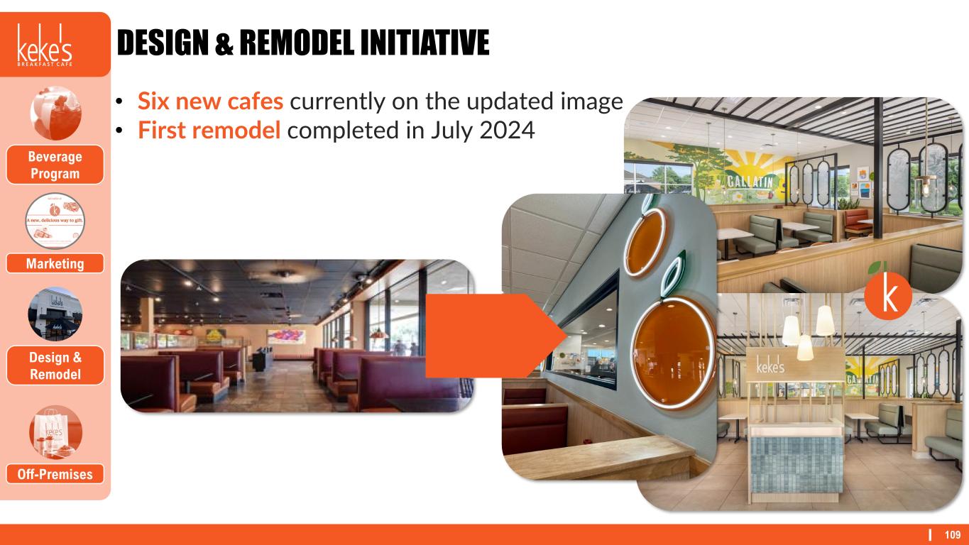 108 EVOLVING MARKETING PROGRAM Design & Remodel Off-Premises Beverage Program Marketing • First paid media campaign in Q3’24 • 4%-6% Transaction Lift
