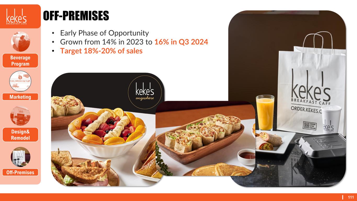 111 OFF-PREMISES Design& Remodel Off-Premises Beverage Program Marketing • Early Phase of Opportunity • Grown from 14% in 2023 to 16% in Q3 2024 • Target 18%-20% of sales