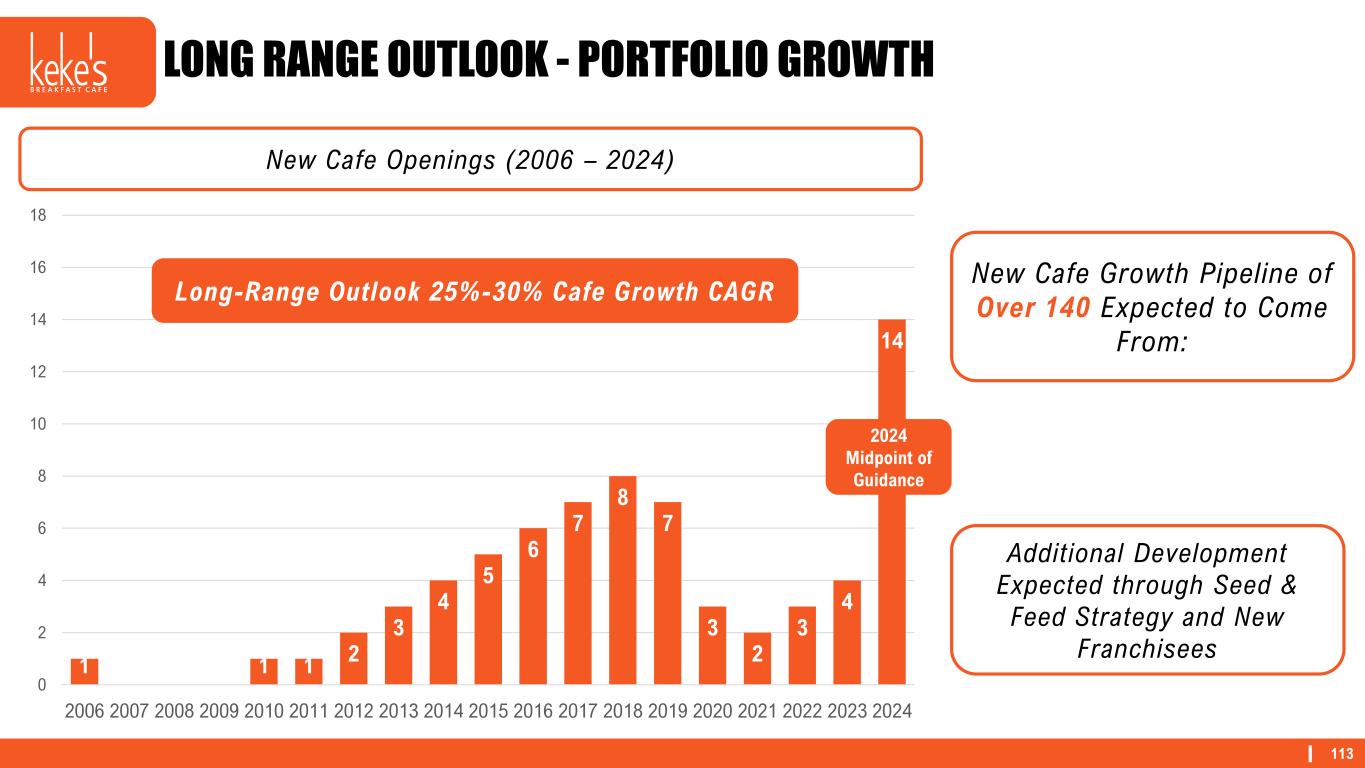 113 1 0 0 0 1 1 2 3 4 5 6 7 8 7 3 2 3 4 14 0 2 4 6 8 10 12 14 16 18 20 2006 2007 2008 2009 2010 2011 2012 2013 2014 2015 2016 2017 2018 2019 2020 2021 2022 2023 2024 LONG RANGE OUTLOOK - PORTFOLIO GROWTH New Cafe Openings (2006 – 2024) New Cafe Growth Pipeline of Over 140 Expected to Come From: 2024 Midpoint of Guidance Long-Range Outlook 25%-30% Cafe Growth CAGR Additional Development Expected through Seed & Feed Strategy and New Franchisees