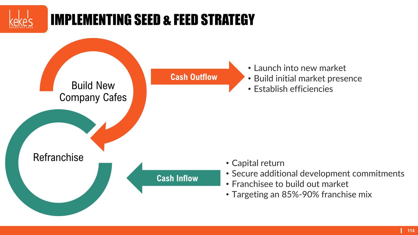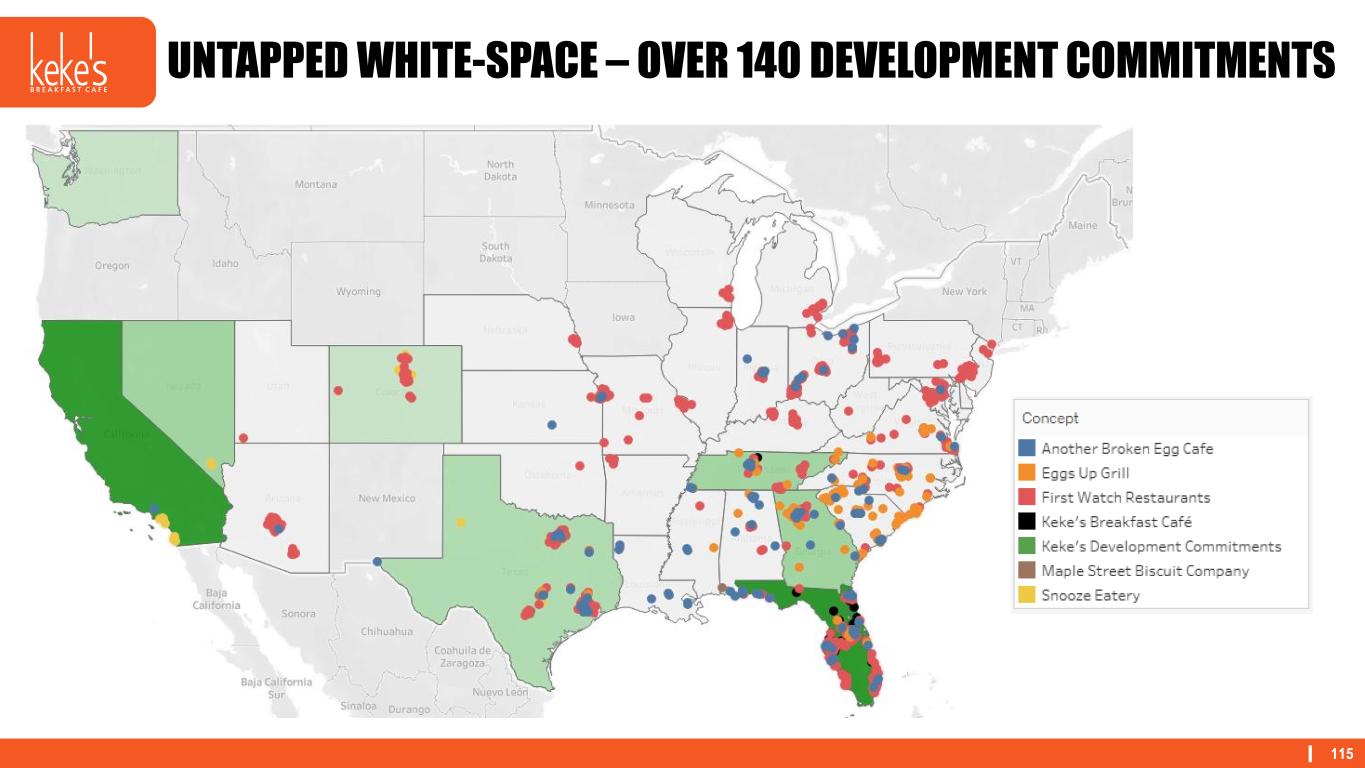 114 IMPLEMENTING SEED & FEED STRATEGY Build New Company Cafes Refranchise Cash Outflow • Launch into new market • Build initial market presence • Establish efficiencies Cash Inflow • Capital return • Secure additional development commitments • Franchisee to build out market • Targeting an 85%-90% franchise mix