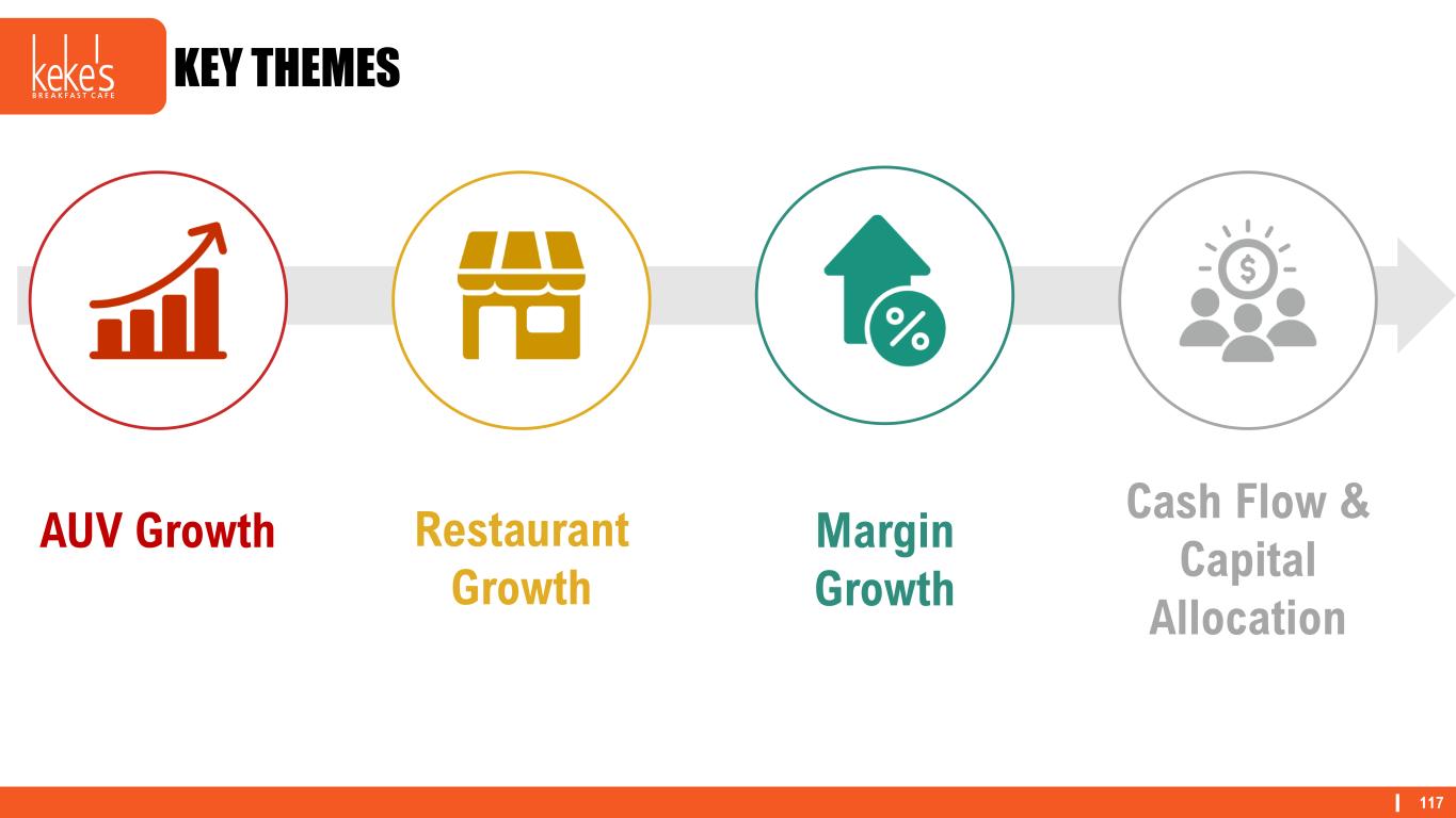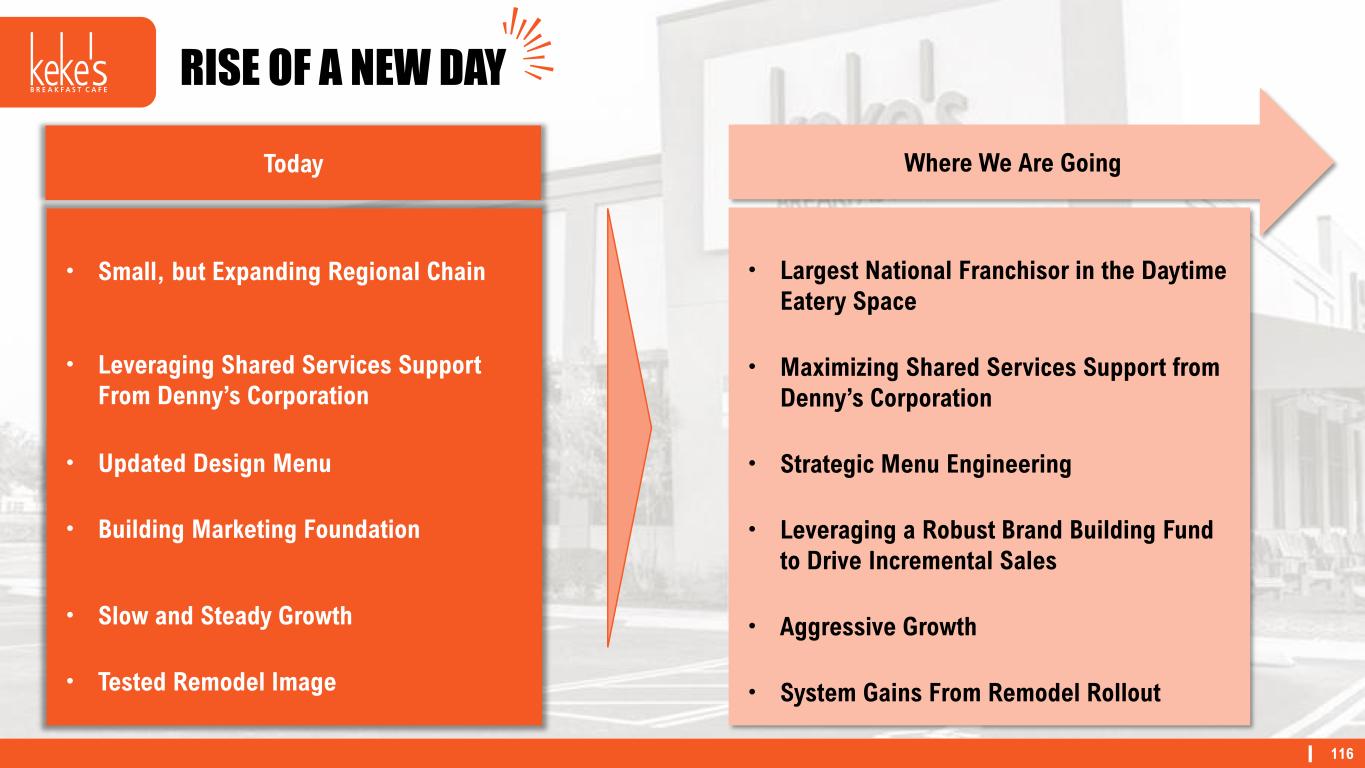 116 RISE OF A NEW DAY • Small, but Expanding Regional Chain • Leveraging Shared Services Support From Denny’s Corporation • Updated Design Menu • Building Marketing Foundation • Slow and Steady Growth • Tested Remodel Image • Largest National Franchisor in the Daytime Eatery Space • Maximizing Shared Services Support from Denny’s Corporation • Strategic Menu Engineering • Leveraging a Robust Brand Building Fund to Drive Incremental Sales • Aggressive Growth • System Gains From Remodel Rollout Where We Are GoingToday