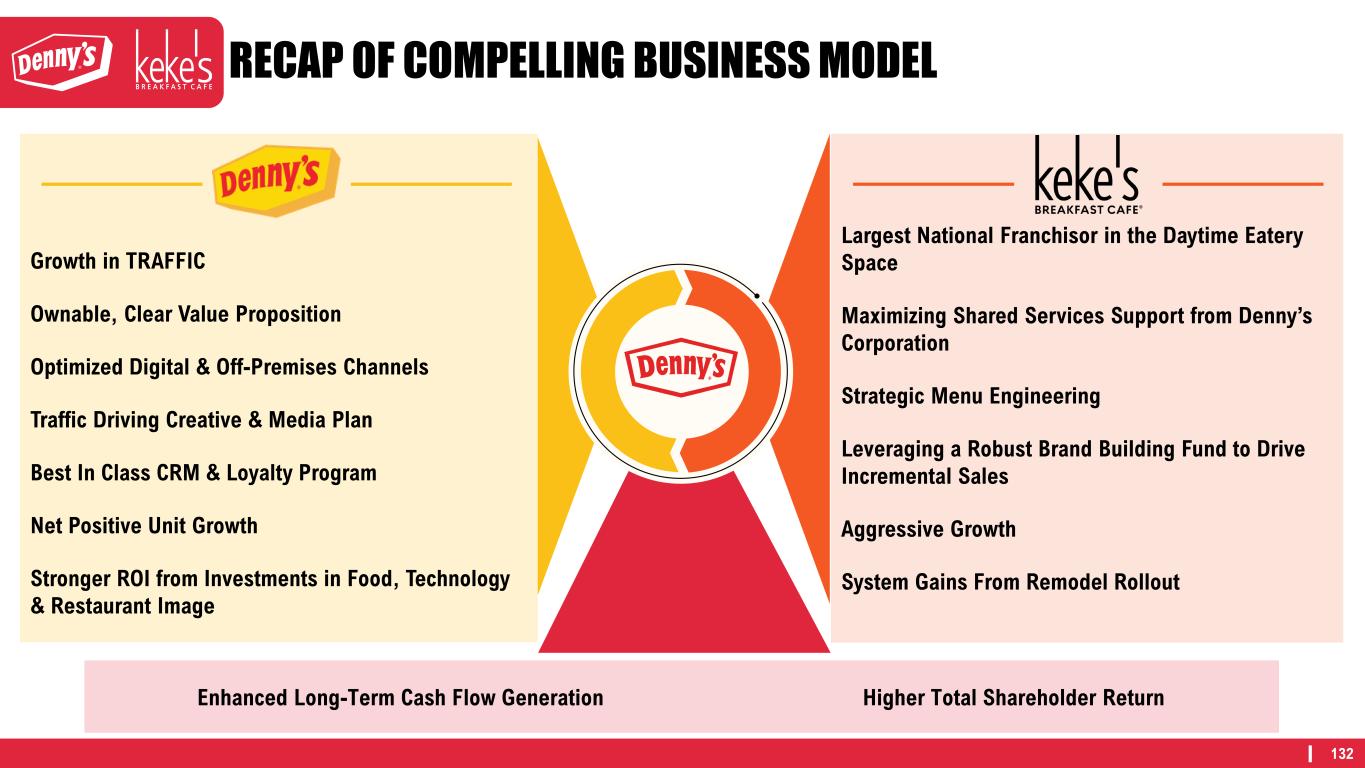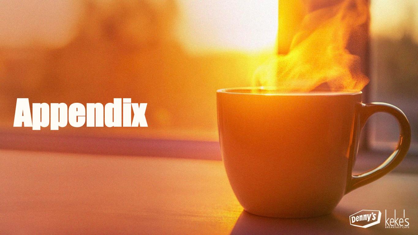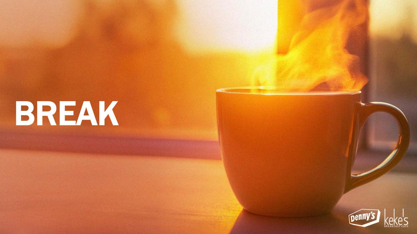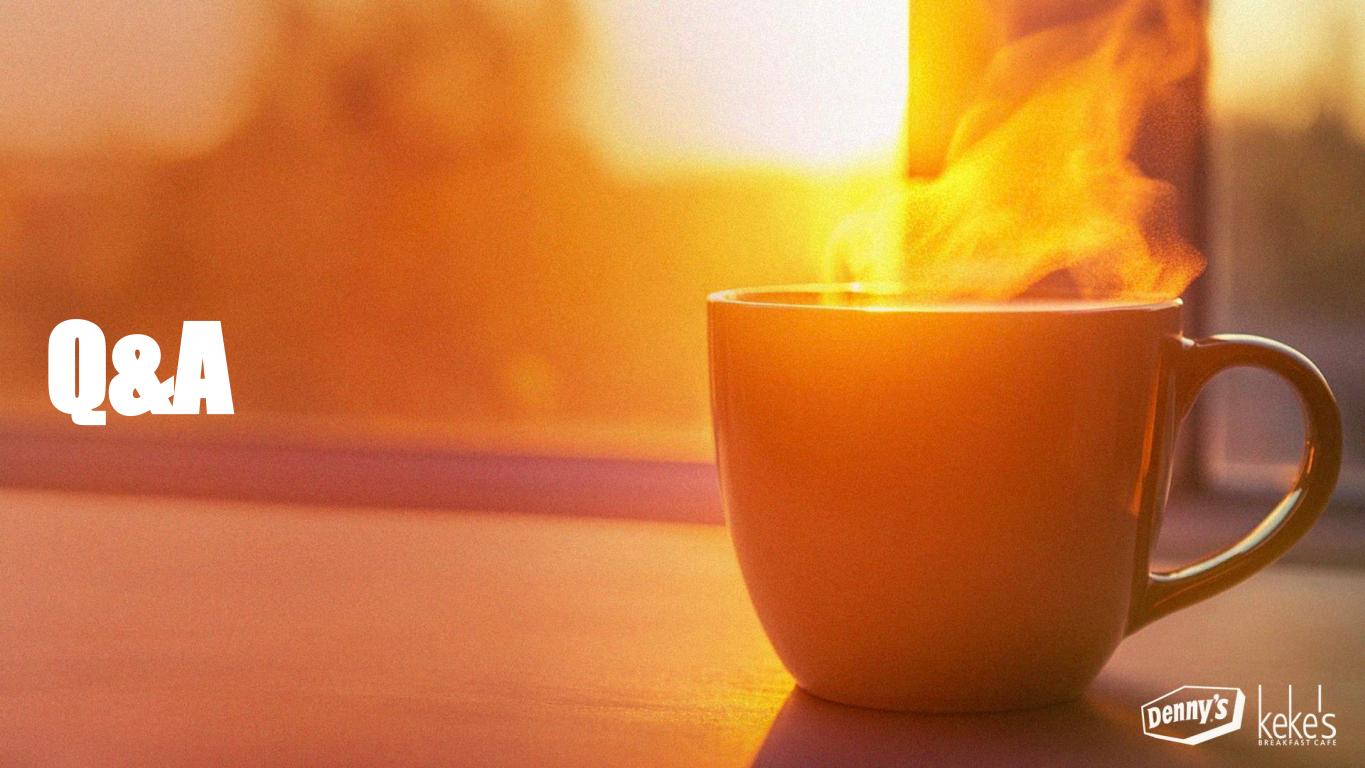 132 RECAP OF COMPELLING BUSINESS MODEL Largest National Franchisor in the Daytime Eatery Space Maximizing Shared Services Support from Denny’s Corporation Strategic Menu Engineering Leveraging a Robust Brand Building Fund to Drive Incremental Sales Aggressive Growth System Gains From Remodel Rollout % of Sales (a) Growth in TRAFFIC Ownable, Clear Value Proposition Optimized Digital & Off-Premises Channels Traffic Driving Creative & Media Plan Best In Class CRM & Loyalty Program Net Positive Unit Growth Stronger ROI from Investments in Food, Technology & Restaurant Image Enhanced Long-Term Cash Flow Generation Higher Total Shareholder Return