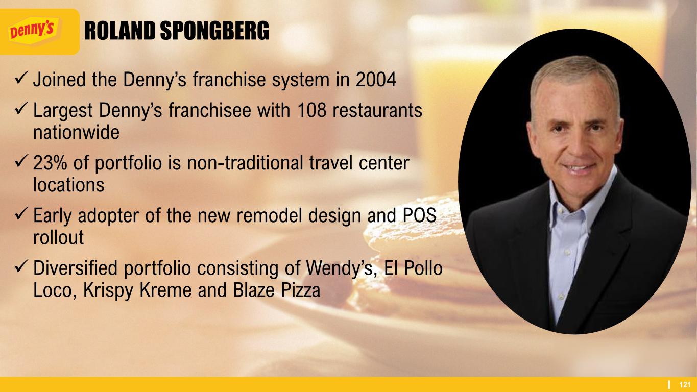 121 ROLAND SPONGBERG ✓ Joined the Denny’s franchise system in 2004 ✓ Largest Denny’s franchisee with 108 restaurants nationwide ✓ 23% of portfolio is non-traditional travel center locations ✓ Early adopter of the new remodel design and POS rollout ✓Diversified portfolio consisting of Wendy’s, El Pollo Loco, Krispy Kreme and Blaze Pizza