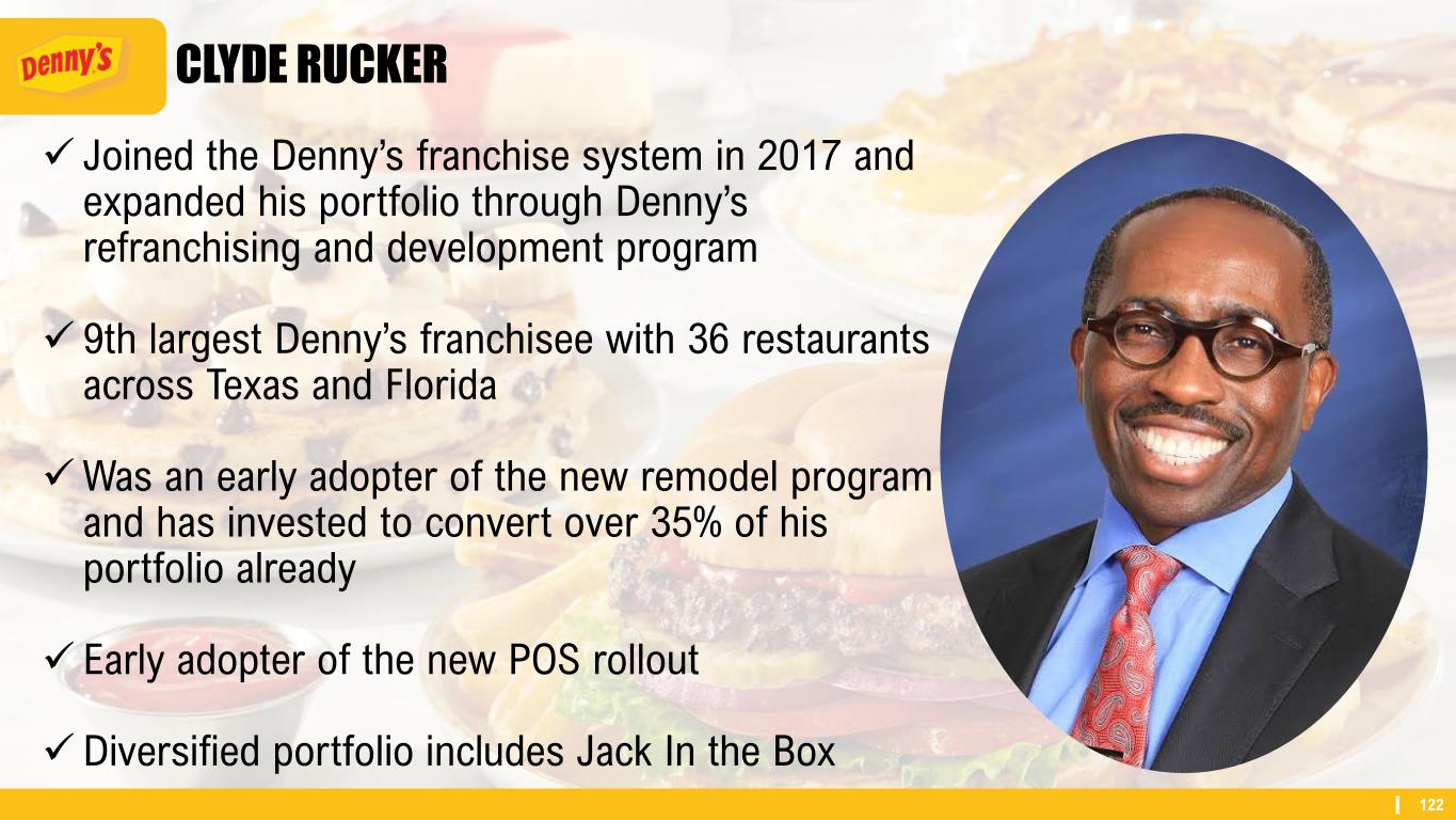 122 CLYDE RUCKER ✓ Joined the Denny’s franchise system in 2017 and expanded his portfolio through Denny’s refranchising and development program ✓ 9th largest Denny’s franchisee with 36 restaurants across Texas and Florida ✓Was an early adopter of the new remodel program and has invested to convert over 35% of his portfolio already ✓ Early adopter of the new POS rollout ✓Diversified portfolio includes Jack In the Box