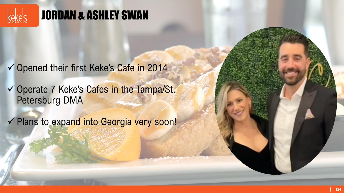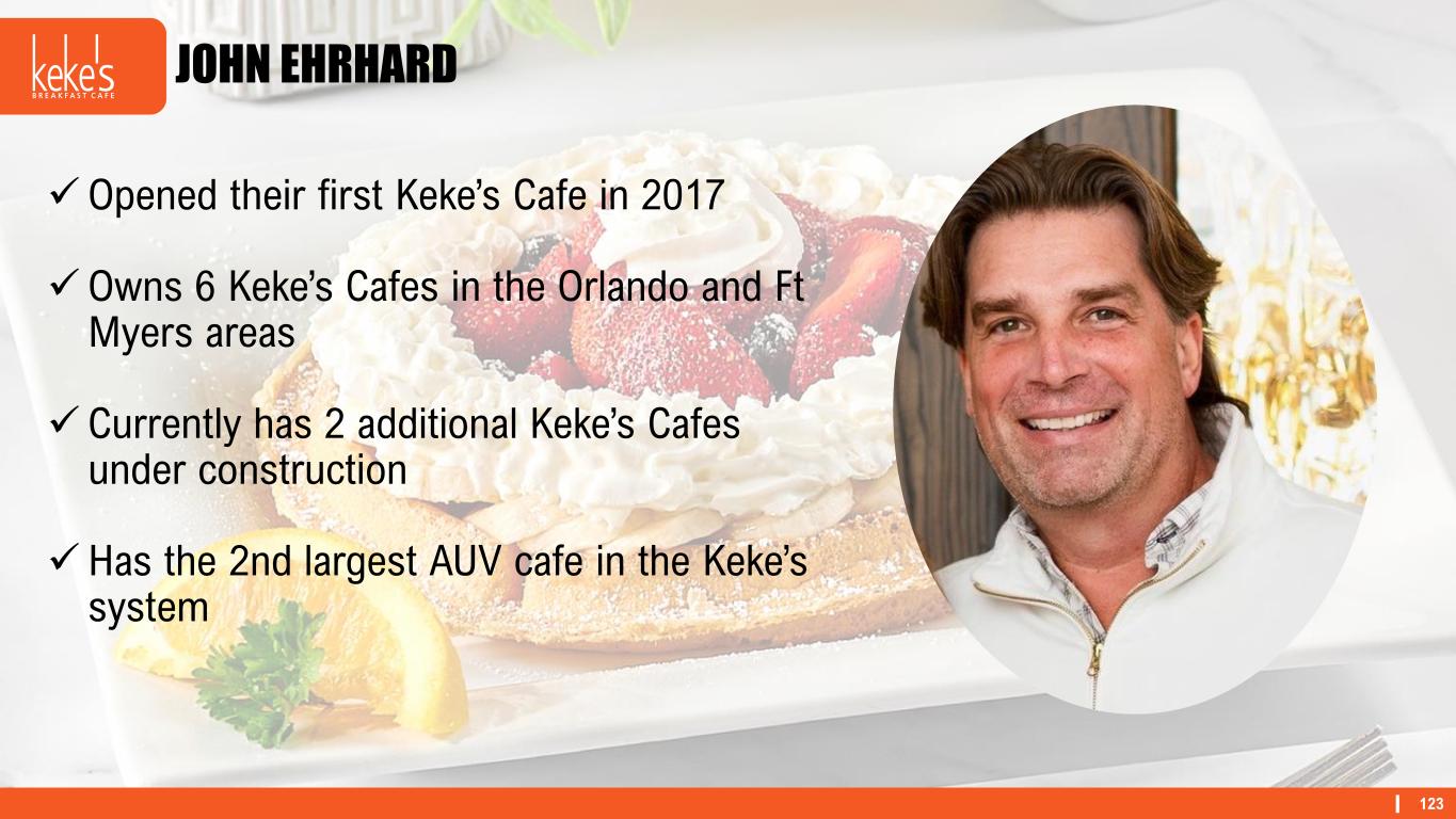 123 ✓Opened their first Keke’s Cafe in 2017 ✓Owns 6 Keke’s Cafes in the Orlando and Ft Myers areas ✓ Currently has 2 additional Keke’s Cafes under construction ✓Has the 2nd largest AUV cafe in the Keke’s system JOHN EHRHARD