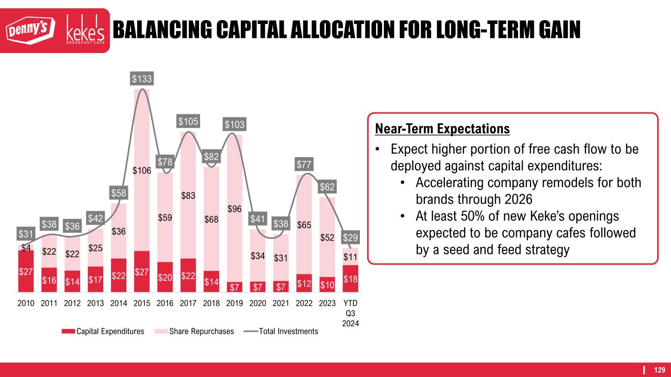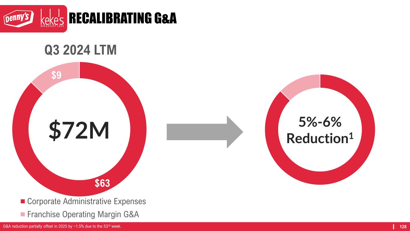 128 RECALIBRATING G&A $63 $9 Q3 2024 LTM Corporate Administrative Expenses Franchise Operating Margin G&A $72M 5%-6% Reduction1 G&A reduction partially offset in 2025 by ~1.5% due to the 53rd week.