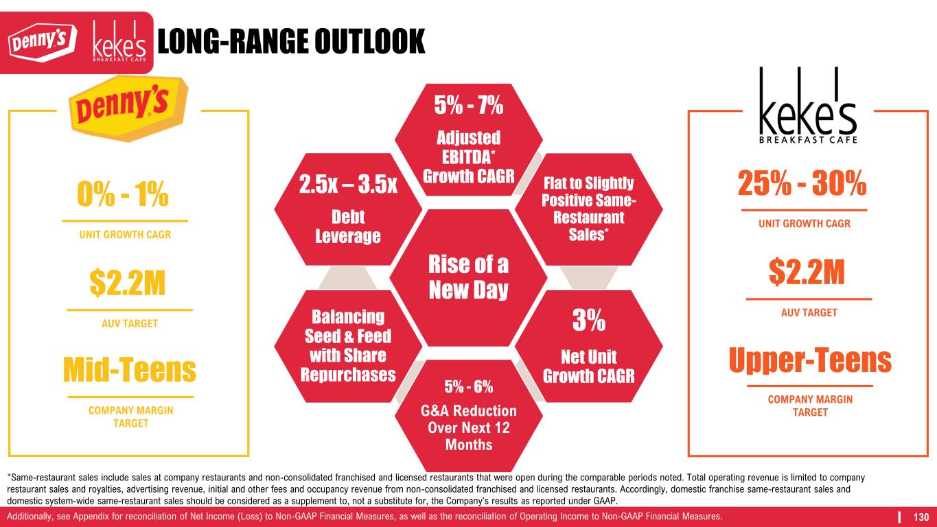 130 Rise of a New Day 5% - 7% Adjusted EBITDA* Growth CAGR Flat to Slightly Positive Same- Restaurant Sales* 3% Net Unit Growth CAGR 5% - 6% G&A Reduction Over Next 12 Months Balancing Seed & Feed with Share Repurchases 2.5x – 3.5x Debt Leverage LONG-RANGE OUTLOOK 0% - 1% UNIT GROWTH CAGR $2.2M AUV TARGET Mid-Teens COMPANY MARGIN TARGET 25% - 30% UNIT GROWTH CAGR $2.2M AUV TARGET Upper-Teens COMPANY MARGIN TARGET *Same-restaurant sales include sales at company restaurants and non-consolidated franchised and licensed restaurants that were open during the comparable periods noted. Total operating revenue is limited to company restaurant sales and royalties, advertising revenue, initial and other fees and occupancy revenue from non-consolidated franchised and licensed restaurants. Accordingly, domestic franchise same-restaurant sales and domestic system-wide same-restaurant sales should be considered as a supplement to, not a substitute for, the Company’s results as reported under GAAP. Additionally, see Appendix for reconciliation of Net Income (Loss) to Non-GAAP Financial Measures, as well as the reconciliation of Operating Income to Non-GAAP Financial Measures.