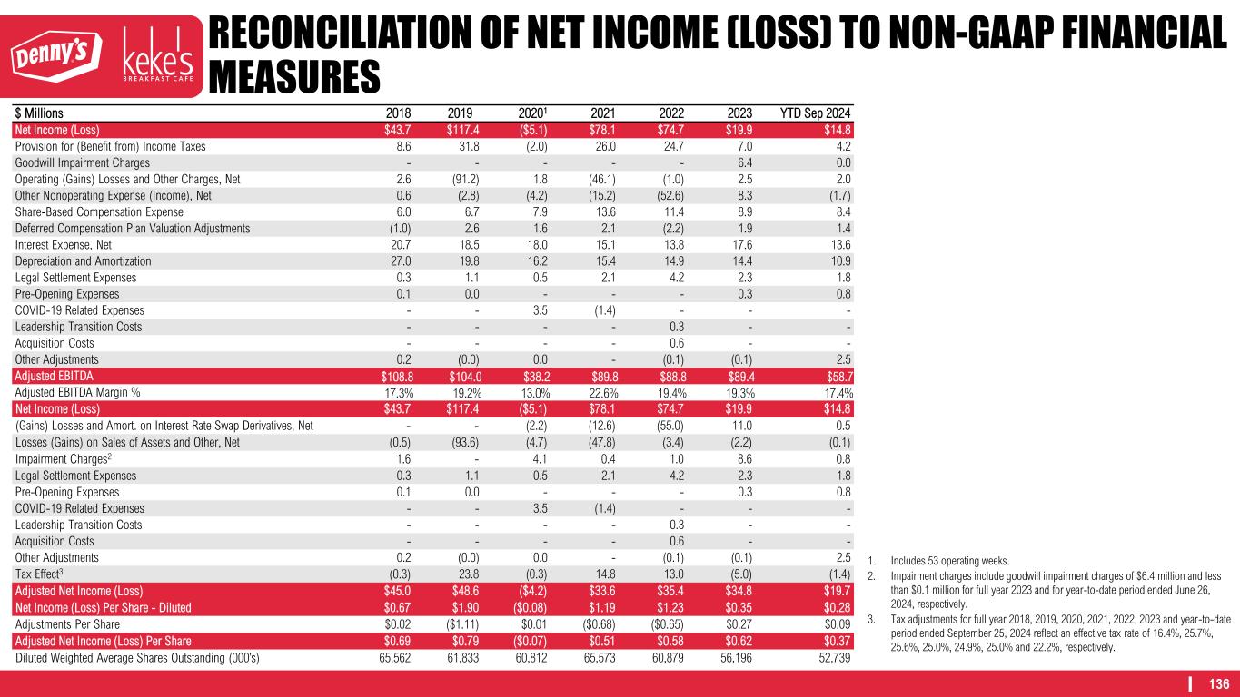 136 RECONCILIATION OF NET INCOME (LOSS) TO NON-GAAP FINANCIAL MEASURES $ Millions 2018 2019 20201 2021 2022 2023 YTD Sep 2024 Net Income (Loss) $43.7 $117.4 ($5.1) $78.1 $74.7 $19.9 $14.8 Provision for (Benefit from) Income Taxes 8.6 31.8 (2.0) 26.0 24.7 7.0 4.2 Goodwill Impairment Charges - - - - - 6.4 0.0 Operating (Gains) Losses and Other Charges, Net 2.6 (91.2) 1.8 (46.1) (1.0) 2.5 2.0 Other Nonoperating Expense (Income), Net 0.6 (2.8) (4.2) (15.2) (52.6) 8.3 (1.7) Share‐Based Compensation Expense 6.0 6.7 7.9 13.6 11.4 8.9 8.4 Deferred Compensation Plan Valuation Adjustments (1.0) 2.6 1.6 2.1 (2.2) 1.9 1.4 Interest Expense, Net 20.7 18.5 18.0 15.1 13.8 17.6 13.6 Depreciation and Amortization 27.0 19.8 16.2 15.4 14.9 14.4 10.9 Legal Settlement Expenses 0.3 1.1 0.5 2.1 4.2 2.3 1.8 Pre-Opening Expenses 0.1 0.0 - - - 0.3 0.8 COVID-19 Related Expenses - - 3.5 (1.4) - - - Leadership Transition Costs - - - - 0.3 - - Acquisition Costs - - - - 0.6 - - Other Adjustments 0.2 (0.0) 0.0 - (0.1) (0.1) 2.5 Adjusted EBITDA $108.8 $104.0 $38.2 $89.8 $88.8 $89.4 $58.7 Adjusted EBITDA Margin % 17.3% 19.2% 13.0% 22.6% 19.4% 19.3% 17.4% Net Income (Loss) $43.7 $117.4 ($5.1) $78.1 $74.7 $19.9 $14.8 (Gains) Losses and Amort. on Interest Rate Swap Derivatives, Net - - (2.2) (12.6) (55.0) 11.0 0.5 Losses (Gains) on Sales of Assets and Other, Net (0.5) (93.6) (4.7) (47.8) (3.4) (2.2) (0.1) Impairment Charges2 1.6 - 4.1 0.4 1.0 8.6 0.8 Legal Settlement Expenses 0.3 1.1 0.5 2.1 4.2 2.3 1.8 Pre-Opening Expenses 0.1 0.0 - - - 0.3 0.8 COVID-19 Related Expenses - - 3.5 (1.4) - - - Leadership Transition Costs - - - - 0.3 - - Acquisition Costs - - - - 0.6 - - Other Adjustments 0.2 (0.0) 0.0 - (0.1) (0.1) 2.5 Tax Effect3 (0.3) 23.8 (0.3) 14.8 13.0 (5.0) (1.4) Adjusted Net Income (Loss) $45.0 $48.6 ($4.2) $33.6 $35.4 $34.8 $19.7 Net Income (Loss) Per Share - Diluted $0.67 $1.90 ($0.08) $1.19 $1.23 $0.35 $0.28 Adjustments Per Share $0.02 ($1.11) $0.01 ($0.68) ($0.65) $0.27 $0.09 Adjusted Net Income (Loss) Per Share $0.69 $0.79 ($0.07) $0.51 $0.58 $0.62 $0.37 Diluted Weighted Average Shares Outstanding (000’s) 65,562 61,833 60,812 65,573 60,879 56,196 52,739 1. Includes 53 operating weeks. 2. Impairment charges include goodwill impairment charges of $6.4 million and less than $0.1 million for full year 2023 and for year-to-date period ended June 26, 2024, respectively. 3. Tax adjustments for full year 2018, 2019, 2020, 2021, 2022, 2023 and year-to-date period ended September 25, 2024 reflect an effective tax rate of 16.4%, 25.7%, 25.6%, 25.0%, 24.9%, 25.0% and 22.2%, respectively.