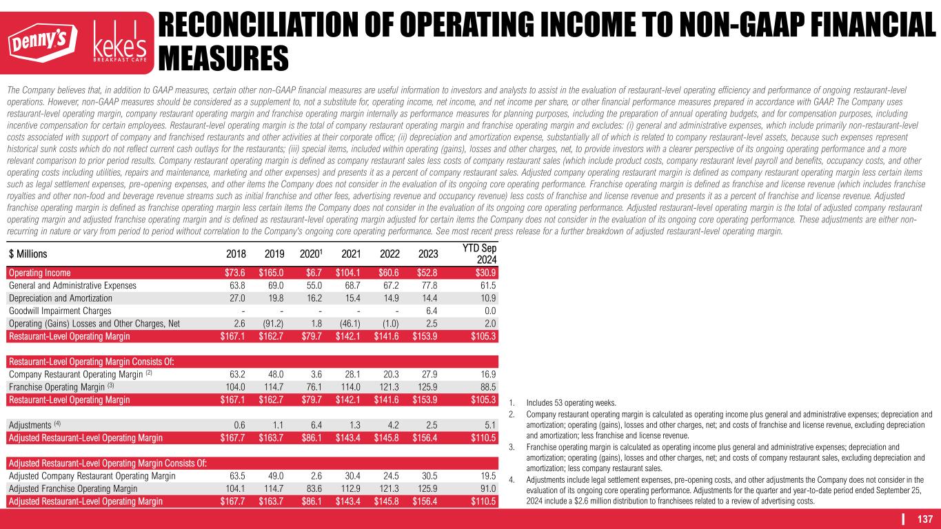 137 RECONCILIATION OF OPERATING INCOME TO NON-GAAP FINANCIAL MEASURES The Company believes that, in addition to GAAP measures, certain other non-GAAP financial measures are useful information to investors and analysts to assist in the evaluation of restaurant-level operating efficiency and performance of ongoing restaurant-level operations. However, non-GAAP measures should be considered as a supplement to, not a substitute for, operating income, net income, and net income per share, or other financial performance measures prepared in accordance with GAAP. The Company uses restaurant-level operating margin, company restaurant operating margin and franchise operating margin internally as performance measures for planning purposes, including the preparation of annual operating budgets, and for compensation purposes, including incentive compensation for certain employees. Restaurant-level operating margin is the total of company restaurant operating margin and franchise operating margin and excludes: (i) general and administrative expenses, which include primarily non-restaurant-level costs associated with support of company and franchised restaurants and other activities at their corporate office; (ii) depreciation and amortization expense, substantially all of which is related to company restaurant-level assets, because such expenses represent historical sunk costs which do not reflect current cash outlays for the restaurants; (iii) special items, included within operating (gains), losses and other charges, net, to provide investors with a clearer perspective of its ongoing operating performance and a more relevant comparison to prior period results. Company restaurant operating margin is defined as company restaurant sales less costs of company restaurant sales (which include product costs, company restaurant level payroll and benefits, occupancy costs, and other operating costs including utilities, repairs and maintenance, marketing and other expenses) and presents it as a percent of company restaurant sales. Adjusted company operating restaurant margin is defined as company restaurant operating margin less certain items such as legal settlement expenses, pre-opening expenses, and other items the Company does not consider in the evaluation of its ongoing core operating performance. Franchise operating margin is defined as franchise and license revenue (which includes franchise royalties and other non-food and beverage revenue streams such as initial franchise and other fees, advertising revenue and occupancy revenue) less costs of franchise and license revenue and presents it as a percent of franchise and license revenue. Adjusted franchise operating margin is defined as franchise operating margin less certain items the Company does not consider in the evaluation of its ongoing core operating performance. Adjusted restaurant-level operating margin is the total of adjusted company restaurant operating margin and adjusted franchise operating margin and is defined as restaurant-level operating margin adjusted for certain items the Company does not consider in the evaluation of its ongoing core operating performance. These adjustments are either non- recurring in nature or vary from period to period without correlation to the Company's ongoing core operating performance. See most recent press release for a further breakdown of adjusted restaurant-level operating margin. $ Millions 2018 2019 20201 2021 2022 2023 YTD Sep 2024 Operating Income $73.6 $165.0 $6.7 $104.1 $60.6 $52.8 $30.9 General and Administrative Expenses 63.8 69.0 55.0 68.7 67.2 77.8 61.5 Depreciation and Amortization 27.0 19.8 16.2 15.4 14.9 14.4 10.9 Goodwill Impairment Charges - - - - - 6.4 0.0 Operating (Gains) Losses and Other Charges, Net 2.6 (91.2) 1.8 (46.1) (1.0) 2.5 2.0 Restaurant-Level Operating Margin $167.1 $162.7 $79.7 $142.1 $141.6 $153.9 $105.3 Restaurant-Level Operating Margin Consists Of: Company Restaurant Operating Margin (2) 63.2 48.0 3.6 28.1 20.3 27.9 16.9 Franchise Operating Margin (3) 104.0 114.7 76.1 114.0 121.3 125.9 88.5 Restaurant-Level Operating Margin $167.1 $162.7 $79.7 $142.1 $141.6 $153.9 $105.3 Adjustments (4) 0.6 1.1 6.4 1.3 4.2 2.5 5.1 Adjusted Restaurant-Level Operating Margin $167.7 $163.7 $86.1 $143.4 $145.8 $156.4 $110.5 Adjusted Restaurant-Level Operating Margin Consists Of: Adjusted Company Restaurant Operating Margin 63.5 49.0 2.6 30.4 24.5 30.5 19.5 Adjusted Franchise Operating Margin 104.1 114.7 83.6 112.9 121.3 125.9 91.0 Adjusted Restaurant-Level Operating Margin $167.7 $163.7 $86.1 $143.4 $145.8 $156.4 $110.5 1. Includes 53 operating weeks. 2. Company restaurant operating margin is calculated as operating income plus general and administrative expenses; depreciation and amortization; operating (gains), losses and other charges, net; and costs of franchise and license revenue, excluding depreciation and amortization; less franchise and license revenue. 3. Franchise operating margin is calculated as operating income plus general and administrative expenses; depreciation and amortization; operating (gains), losses and other charges, net; and costs of company restaurant sales, excluding depreciation and amortization; less company restaurant sales. 4. Adjustments include legal settlement expenses, pre-opening costs, and other adjustments the Company does not consider in the evaluation of its ongoing core operating performance. Adjustments for the quarter and year-to-date period ended September 25, 2024 include a $2.6 million distribution to franchisees related to a review of advertising costs.