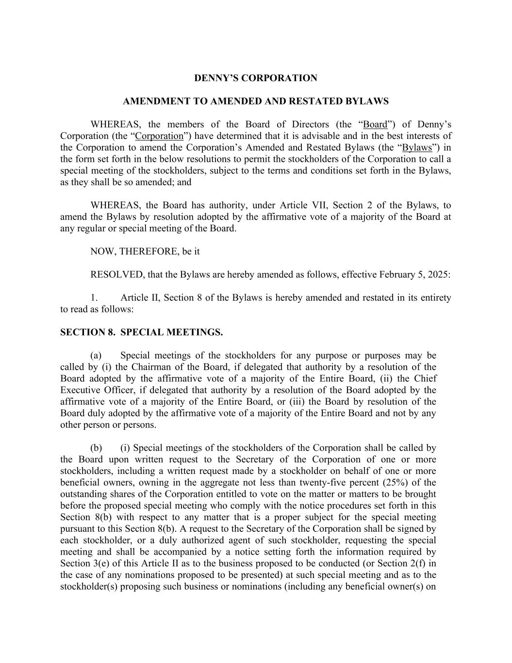 DENNY’S CORPORATION AMENDMENT TO AMENDED AND RESTATED BYLAWS WHEREAS, the members of the Board of Directors (the “Board”) of Denny’s Corporation (the “Corporation”) have determined that it is advisable and in the best interests of the Corporation to amend the Corporation’s Amended and Restated Bylaws (the “Bylaws”) in the form set forth in the below resolutions to permit the stockholders of the Corporation to call a special meeting of the stockholders, subject to the terms and conditions set forth in the Bylaws, as they shall be so amended; and WHEREAS, the Board has authority, under Article VII, Section 2 of the Bylaws, to amend the Bylaws by resolution adopted by the affirmative vote of a majority of the Board at any regular or special meeting of the Board. NOW, THEREFORE, be it RESOLVED, that the Bylaws are hereby amended as follows, effective February 5, 2025: 1. Article II, Section 8 of the Bylaws is hereby amended and restated in its entirety to read as follows: SECTION 8. SPECIAL MEETINGS. (a) Special meetings of the stockholders for any purpose or purposes may be called by (i) the Chairman of the Board, if delegated that authority by a resolution of the Board adopted by the affirmative vote of a majority of the Entire Board, (ii) the Chief Executive Officer, if delegated that authority by a resolution of the Board adopted by the affirmative vote of a majority of the Entire Board, or (iii) the Board by resolution of the Board duly adopted by the affirmative vote of a majority of the Entire Board and not by any other person or persons. (b) (i) Special meetings of the stockholders of the Corporation shall be called by the Board upon written request to the Secretary of the Corporation of one or more stockholders, including a written request made by a stockholder on behalf of one or more beneficial owners, owning in the aggregate not less than twenty-five percent (25%) of the outstanding shares of the Corporation entitled to vote on the matter or matters to be brought before the proposed special meeting who comply with the notice procedures set forth in this Section 8(b) with respect to any matter that is a proper subject for the special meeting pursuant to this Section 8(b). A request to the Secretary of the Corporation shall be signed by each stockholder, or a duly authorized agent of such stockholder, requesting the special meeting and shall be accompanied by a notice setting forth the information required by Section 3(e) of this Article II as to the business proposed to be conducted (or Section 2(f) in the case of any nominations proposed to be presented) at such special meeting and as to the stockholder(s) proposing such business or nominations (including any beneficial owner(s) on