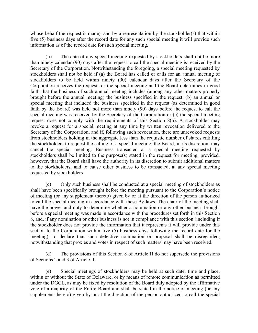 whose behalf the request is made), and by a representation by the stockholder(s) that within five (5) business days after the record date for any such special meeting it will provide such information as of the record date for such special meeting. (ii) The date of any special meeting requested by stockholders shall not be more than ninety calendar (90) days after the request to call the special meeting is received by the Secretary of the Corporation. Notwithstanding the foregoing, a special meeting requested by stockholders shall not be held if (a) the Board has called or calls for an annual meeting of stockholders to be held within ninety (90) calendar days after the Secretary of the Corporation receives the request for the special meeting and the Board determines in good faith that the business of such annual meeting includes (among any other matters properly brought before the annual meeting) the business specified in the request, (b) an annual or special meeting that included the business specified in the request (as determined in good faith by the Board) was held not more than ninety (90) days before the request to call the special meeting was received by the Secretary of the Corporation or (c) the special meeting request does not comply with the requirements of this Section 8(b). A stockholder may revoke a request for a special meeting at any time by written revocation delivered to the Secretary of the Corporation, and if, following such revocation, there are unrevoked requests from stockholders holding in the aggregate less than the requisite number of shares entitling the stockholders to request the calling of a special meeting, the Board, in its discretion, may cancel the special meeting. Business transacted at a special meeting requested by stockholders shall be limited to the purpose(s) stated in the request for meeting, provided, however, that the Board shall have the authority in its discretion to submit additional matters to the stockholders, and to cause other business to be transacted, at any special meeting requested by stockholders (c) Only such business shall be conducted at a special meeting of stockholders as shall have been specifically brought before the meeting pursuant to the Corporation’s notice of meeting (or any supplement thereto) given by or at the direction of the person authorized to call the special meeting in accordance with these By-laws. The chair of the meeting shall have the power and duty to determine whether a nomination or any other business brought before a special meeting was made in accordance with the procedures set forth in this Section 8, and, if any nomination or other business is not in compliance with this section (including if the stockholder does not provide the information that it represents it will provide under this section to the Corporation within five (5) business days following the record date for the meeting), to declare that such defective nomination or proposal shall be disregarded, notwithstanding that proxies and votes in respect of such matters may have been received. (d) The provisions of this Section 8 of Article II do not supersede the provisions of Sections 2 and 3 of Article II. (e) Special meetings of stockholders may be held at such date, time and place, within or without the State of Delaware, or by means of remote communication as permitted under the DGCL, as may be fixed by resolution of the Board duly adopted by the affirmative vote of a majority of the Entire Board and shall be stated in the notice of meeting (or any supplement thereto) given by or at the direction of the person authorized to call the special