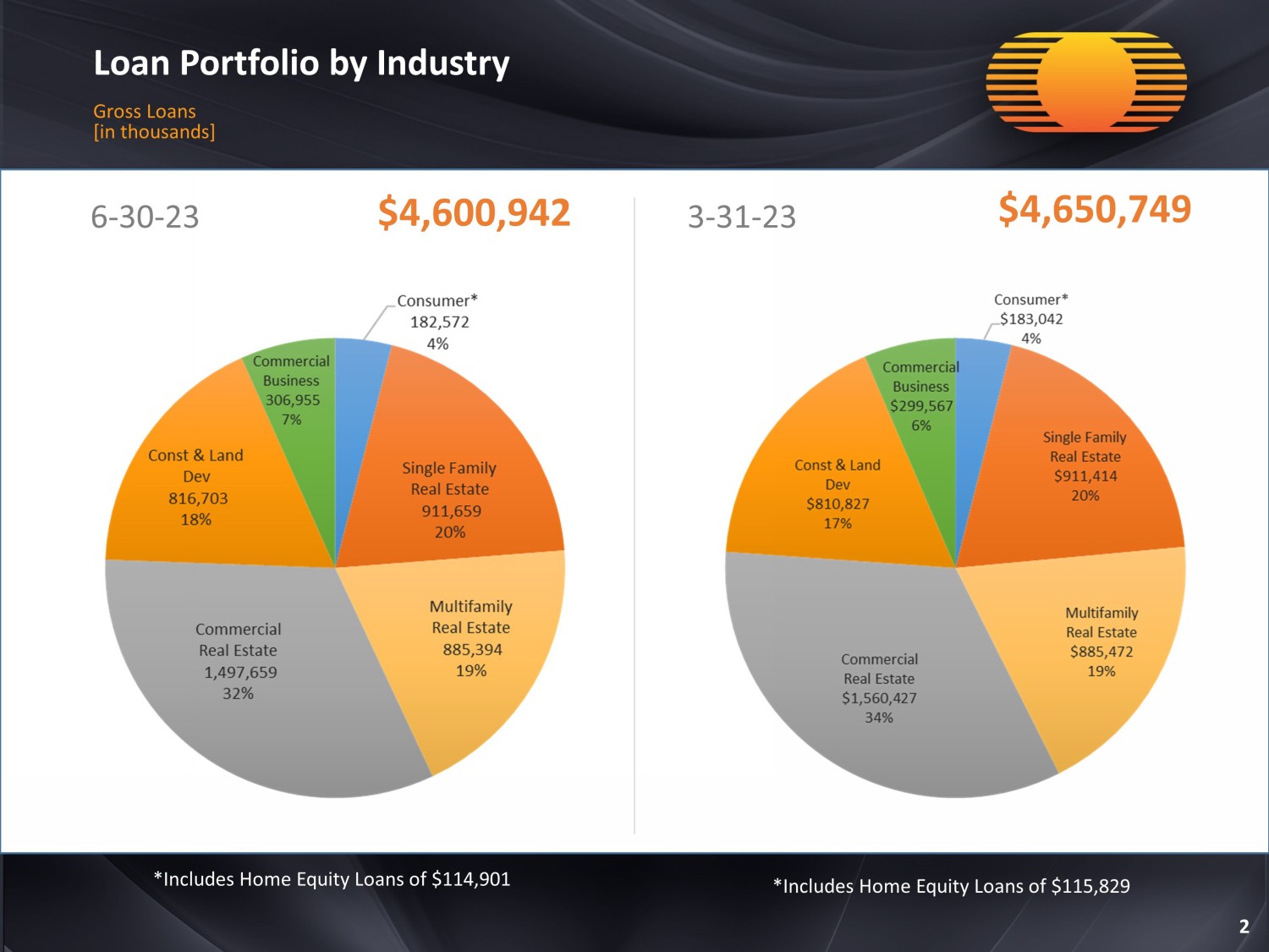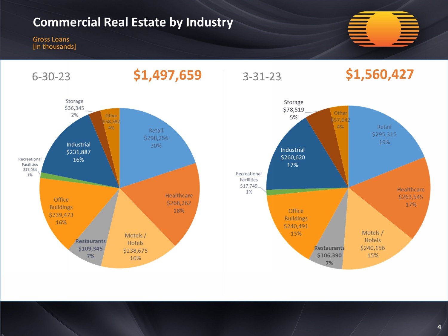 Loan Portfolio by Industry Gross Loans [in thousands] *Includes Home Equity Loans of $114,901 2 *Includes Home Equity Loans of $115,829 6 - 30 - 23 $4,600,942 3 - 31 - 23 $4,650,749