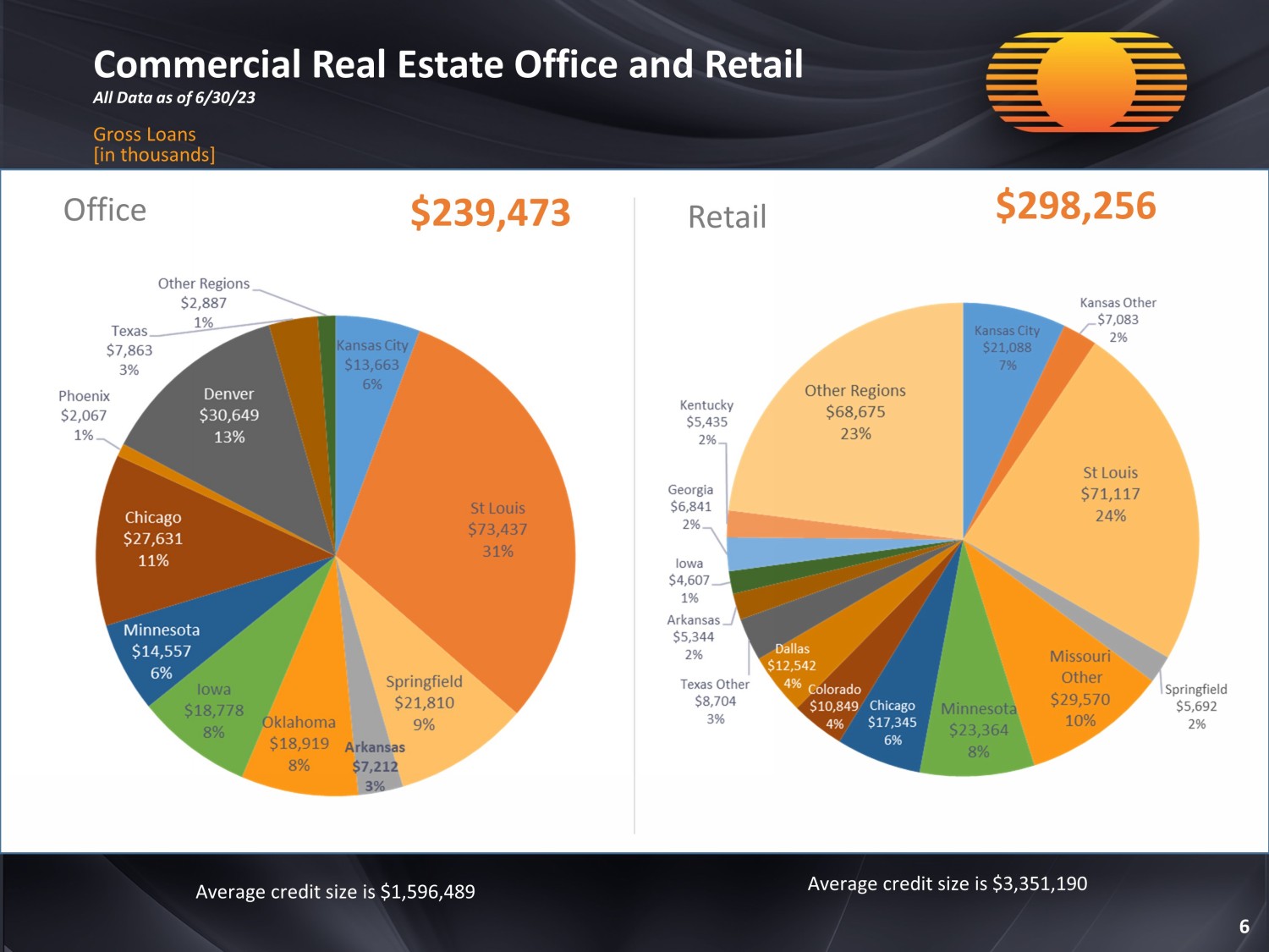 Commercial Real Estate Office and Retail All Data as of 6/30/23 Gross Loans [in thousands] 6 Office $239,473 Retail $298,256 Average credit size is $1,596,489 Average credit size is $3,351,190