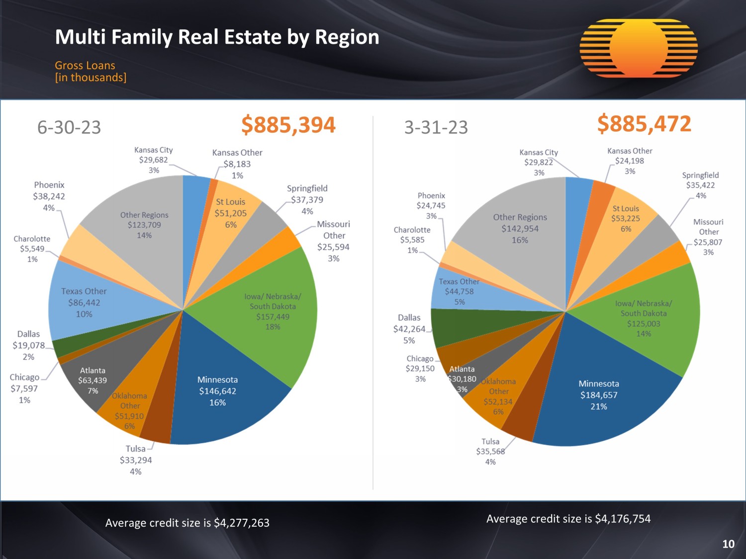 Multi Family Real Estate by Region Gross Loans [in thousands] 10 6 - 30 - 23 $885,394 3 - 31 - 23 $885,472 Average credit size is $4,277,263 Average credit size is $4,176,754