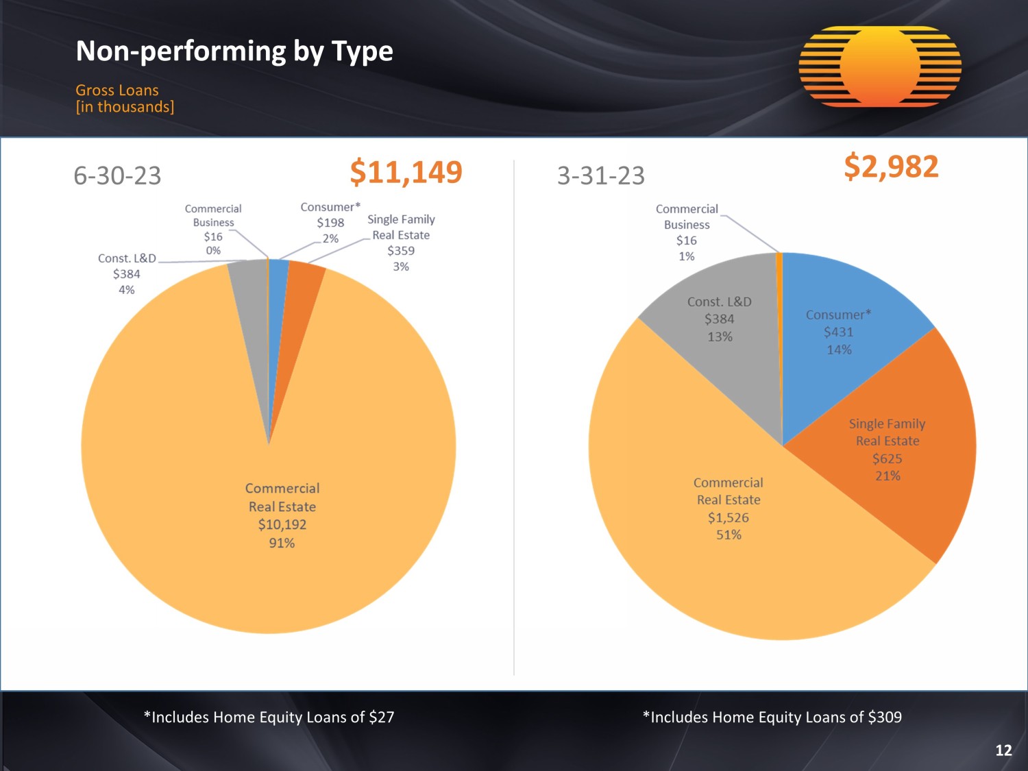 Non - performing by Type Gross Loans [in thousands] 12 6 - 30 - 23 $11,149 3 - 31 - 23 $2,982 *Includes Home Equity Loans of $27 *Includes Home Equity Loans of $309